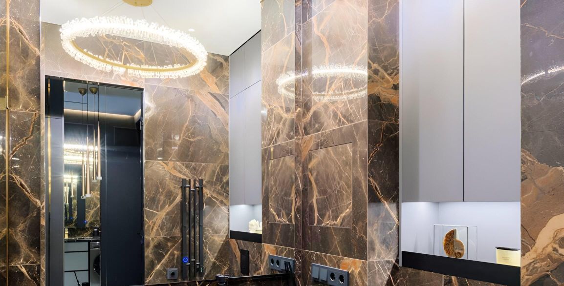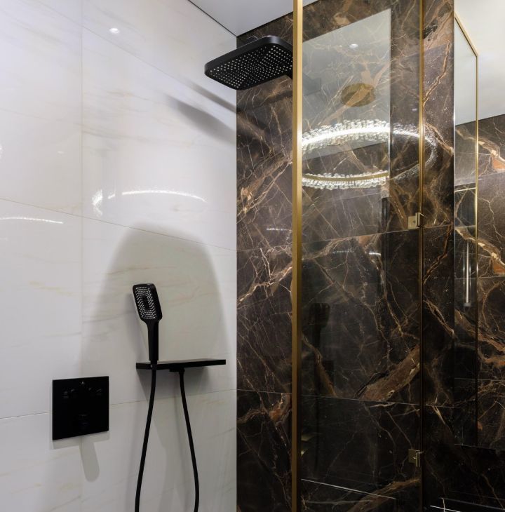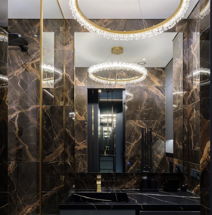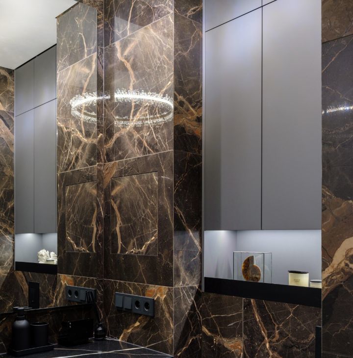 Мраморные фактуры, скрытая подсветка, панорамное остекление, встроенные системы хранения — пространство выглядит и ощущается дороже своей площади.
