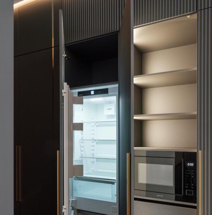 Дизайнерская кухня со столешницей из камня, встроенная техника премиум класса - smeg, холодильник - Liebherr.
