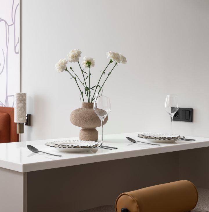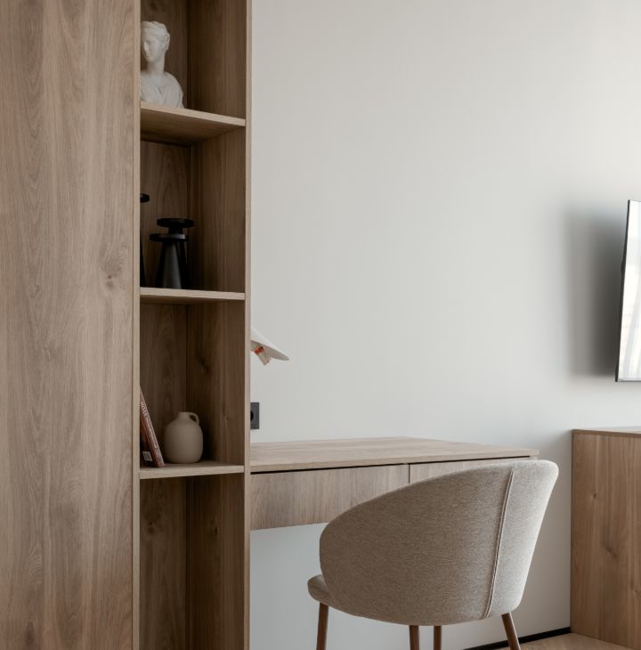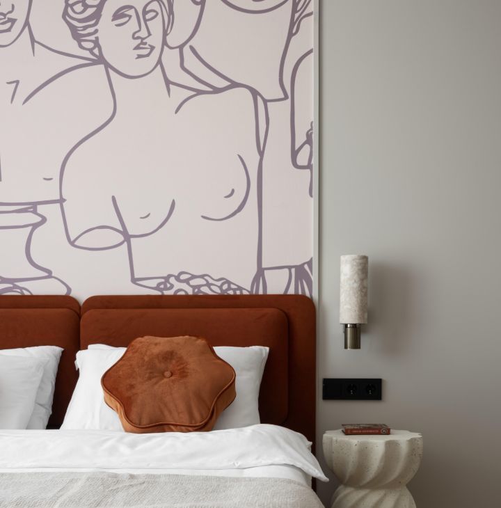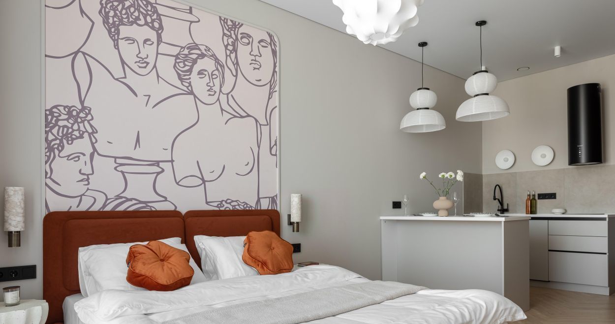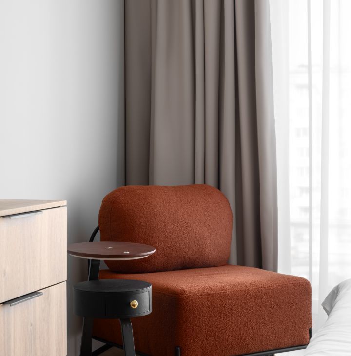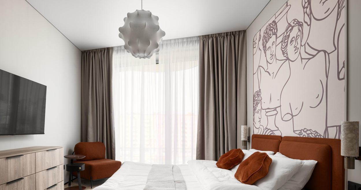 - гостиная зона оснащена дизайнерским диваном, тв-тумбой и телевизором.