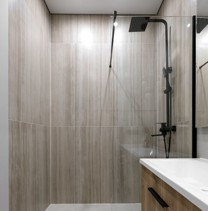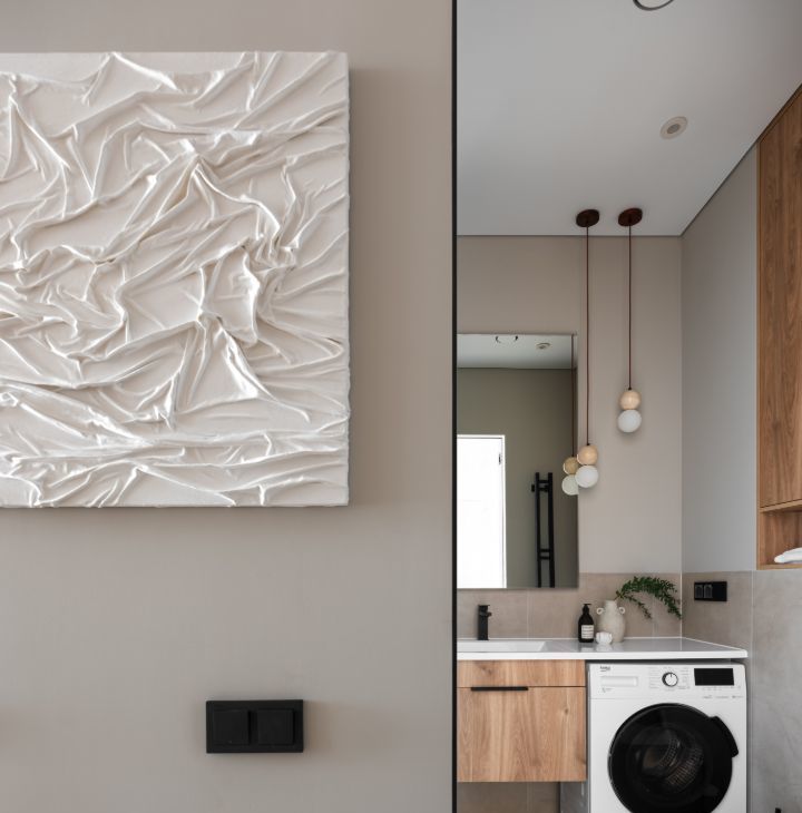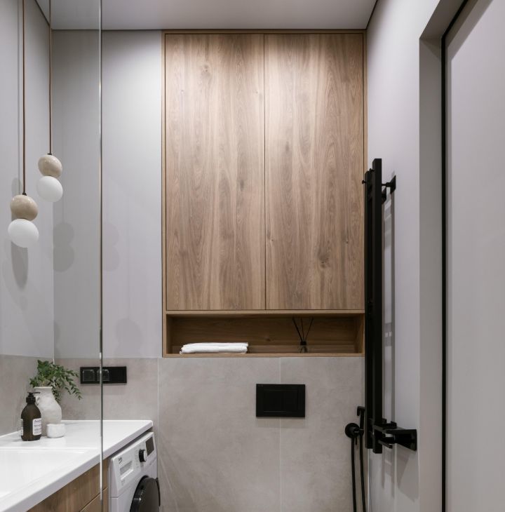 - в ванной комнате оснащена душевая кабина, стиральная машина с функцией сушки, санузлом и теплым полом.
