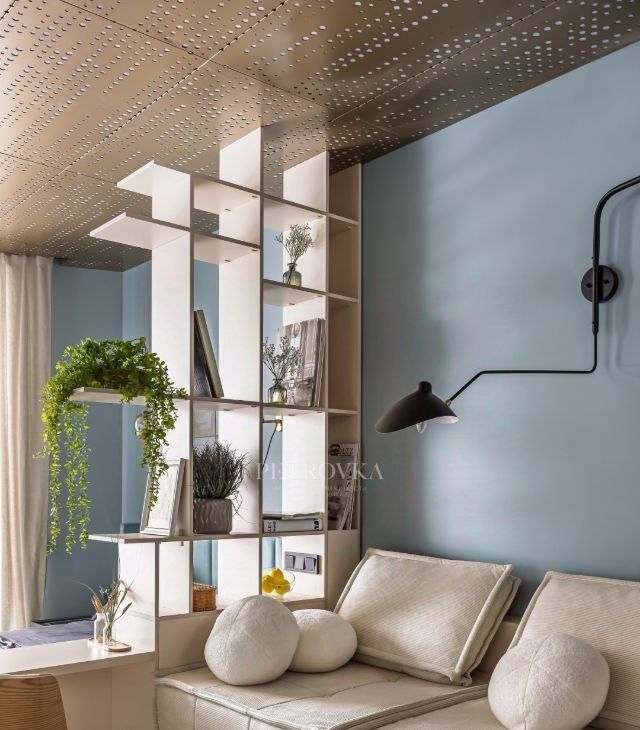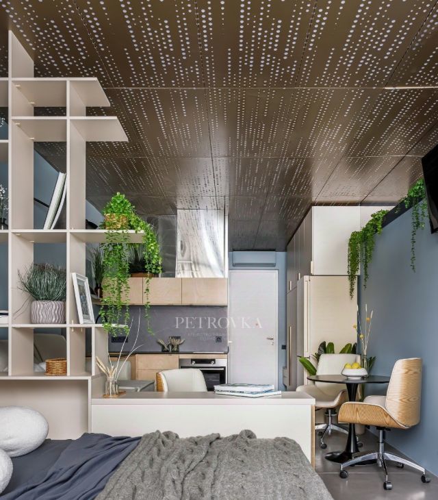 Гибкое зонирование: Ячеистый шкаф-разделитель тонко отделяет уютную спальню от функциональной кухонной зоны, позволяя трансформировать пространство под твой ритм.