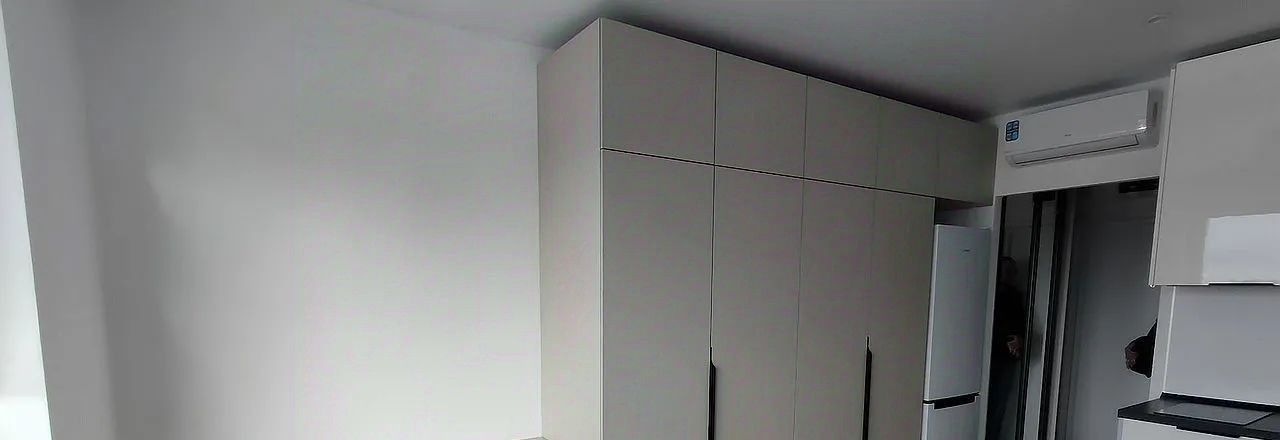 В комнате и на кухне есть вся необходимая мебель, в том числе кондиционер, холодильник и стиральная машина.