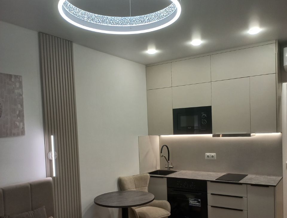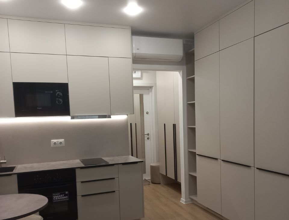 В квартире есть все необходимое для комфортного проживания: кондиционер, втроенный холодильник, телевизор и стиральная машина, духовой шкаф. Установлена современная душевая кабина. На кухне и в комнате вся необходимая мебель, поэтому можно сразу заехать и жить без дополнительных вложений.