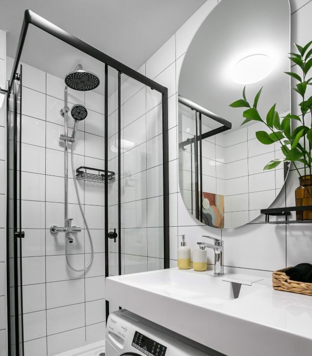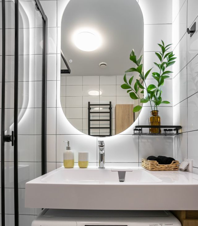 В санузле: стиральная машина с сушкой, тропический душ, зеркало с подсветкой, большая раковина, унитаз, удобные полочки для мелочей.
