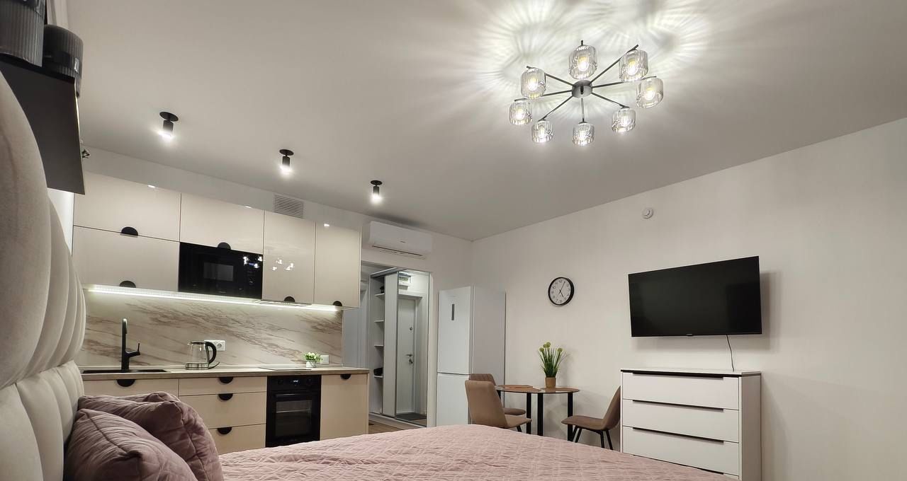 В квартире сделан евроремонт, что создаёт приятную атмосферу для комфортного проживания. В комнате есть вся необходимая мебель. Квартира оснащена современной техникой: кондиционер, холодильник, посудомоечная машина, телевизор и стиральная машина. В ванной комнате установлена душевая кабина.