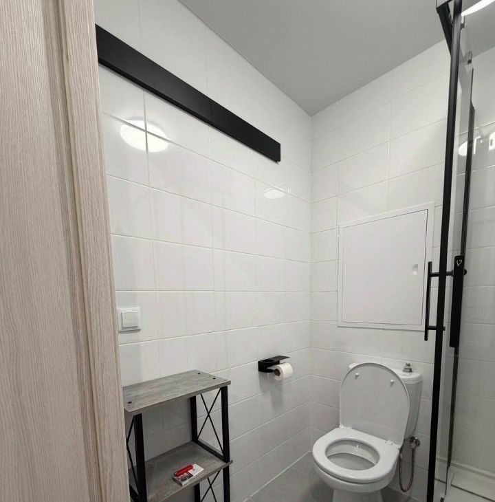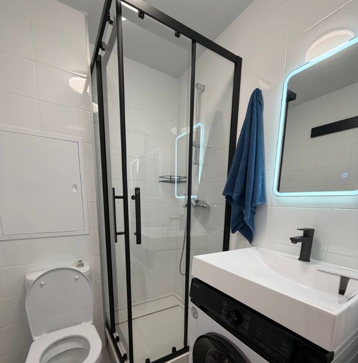 • Отделка санузла: Совмещенный санузел в светлых тонах. Душевая зона оборудована поддоном из натурального мрамора и стеклянными ограждениями итальянского производства.