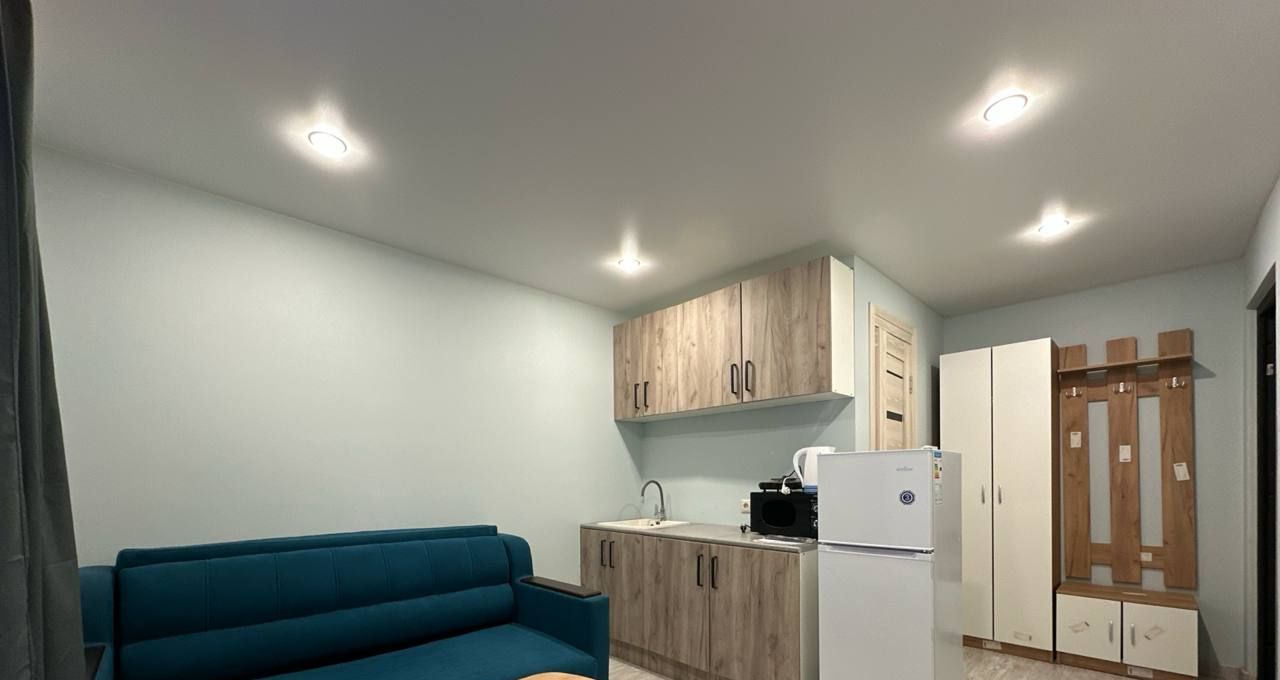 Жилая комната со своей кухонной зоной и отдельным cанузлом.