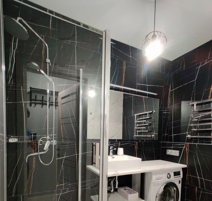 Вся бытовая техника новая и современная: микроволновая печь, электрочайник, сушилка для белья, стиральная машина с функцией сушки, индукционная плита, встроенный холодильник, пылесос, фен, утюг, гладильная доска, гигиенический душ и многое другое.