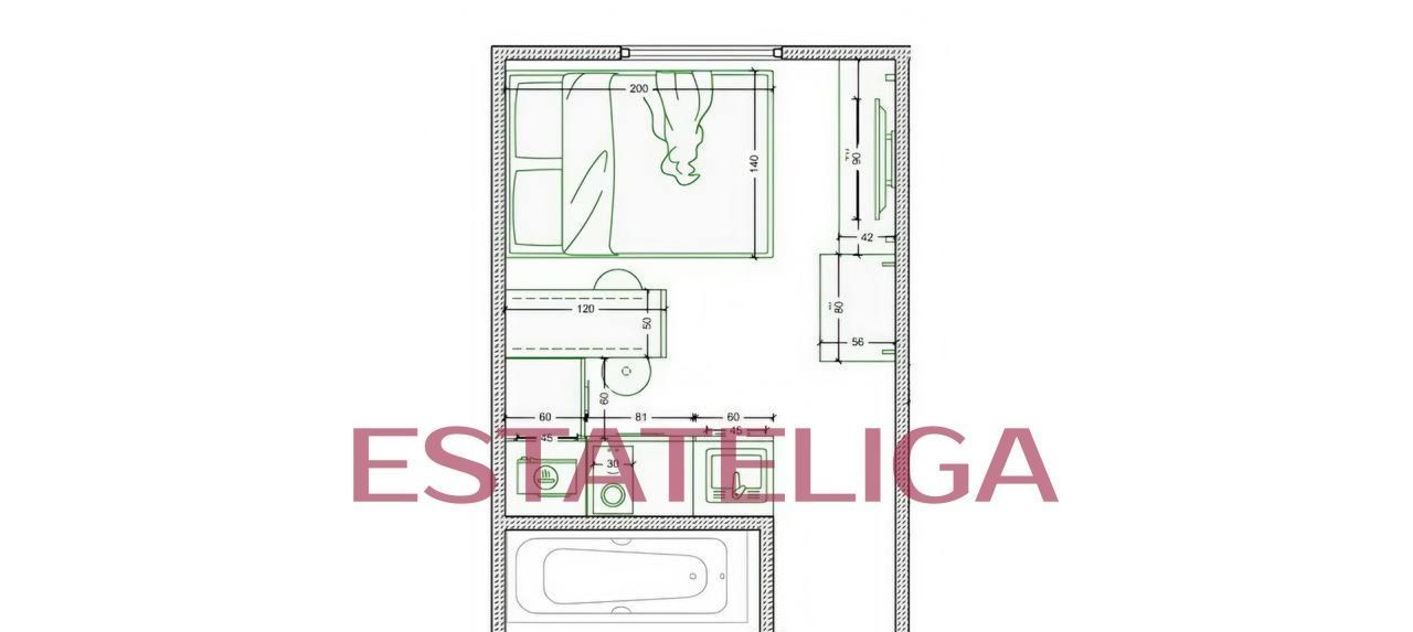 Функциональная планировка студии: зона кухни, обеденная зона, полноценное спальное место, совмещенный санузел с душем.