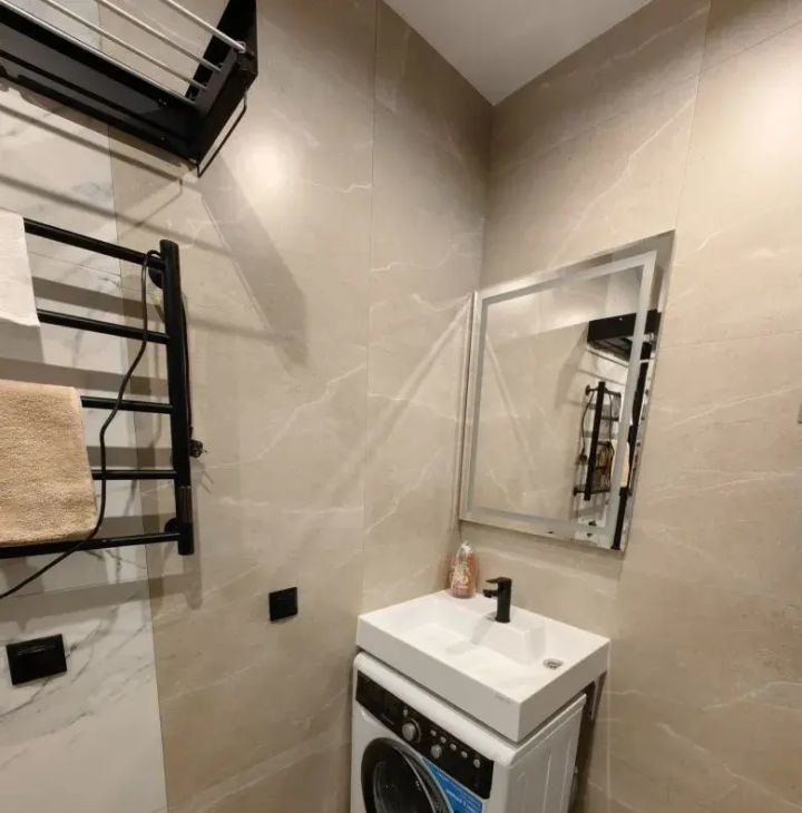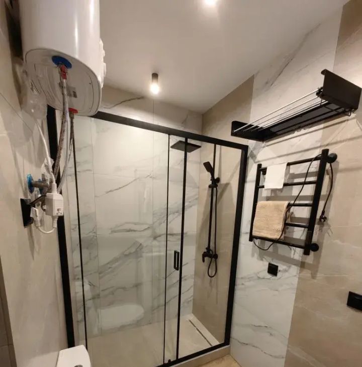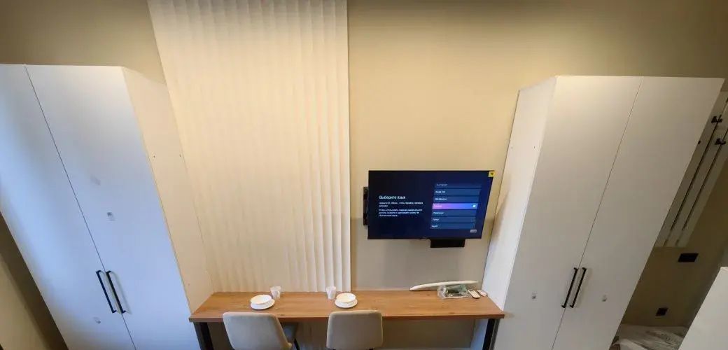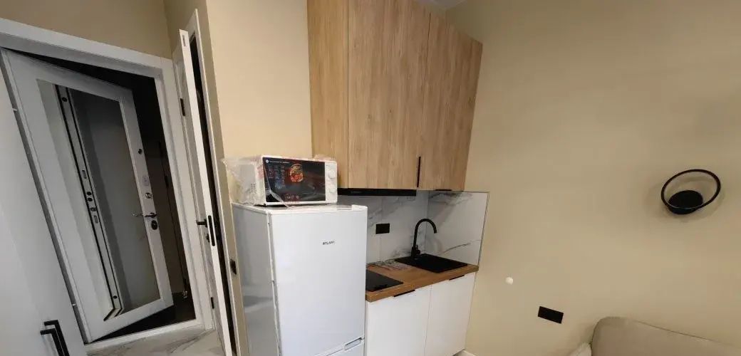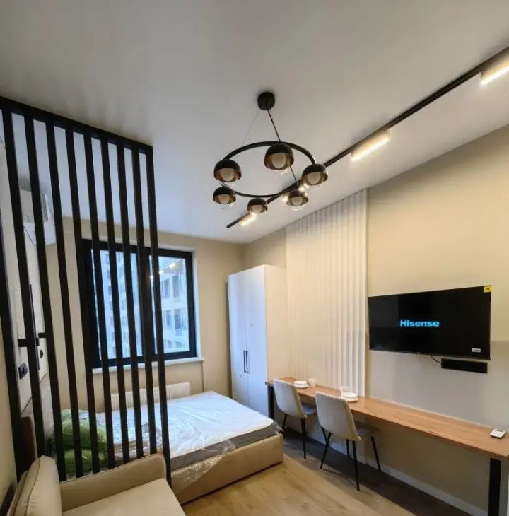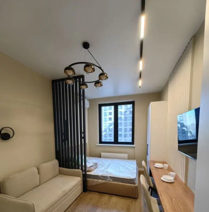 Студия выполнена в дизайнерском стиле, продумана каждая деталь для вашего комфорта. В квартире есть вся необходимая мебель как в комнате, так и на кухне. Из техники установлены кондиционер, холодильник, телевизор и стиральная машина. В ванной комнате — современная душевая кабина. Окна выходят во двор, поэтому в квартире всегда тихо и спокойно.