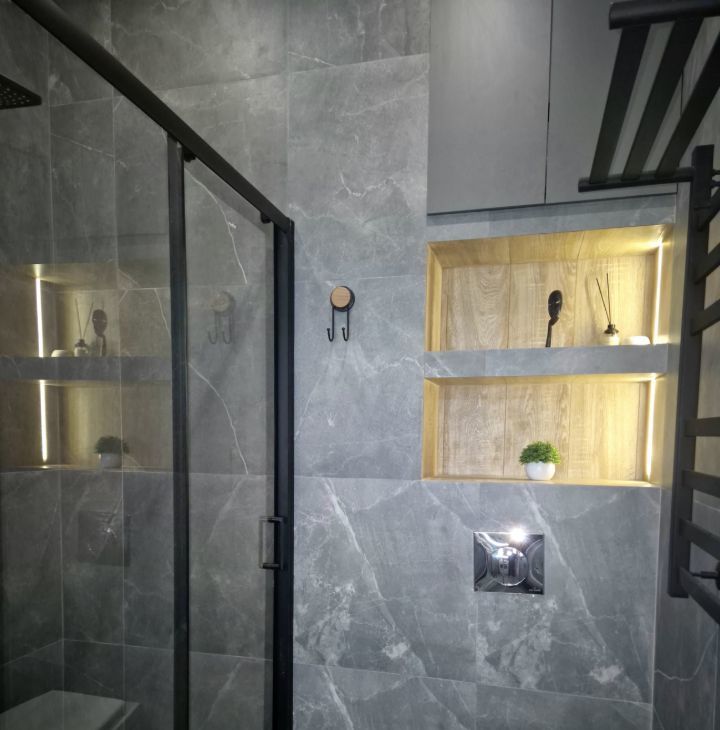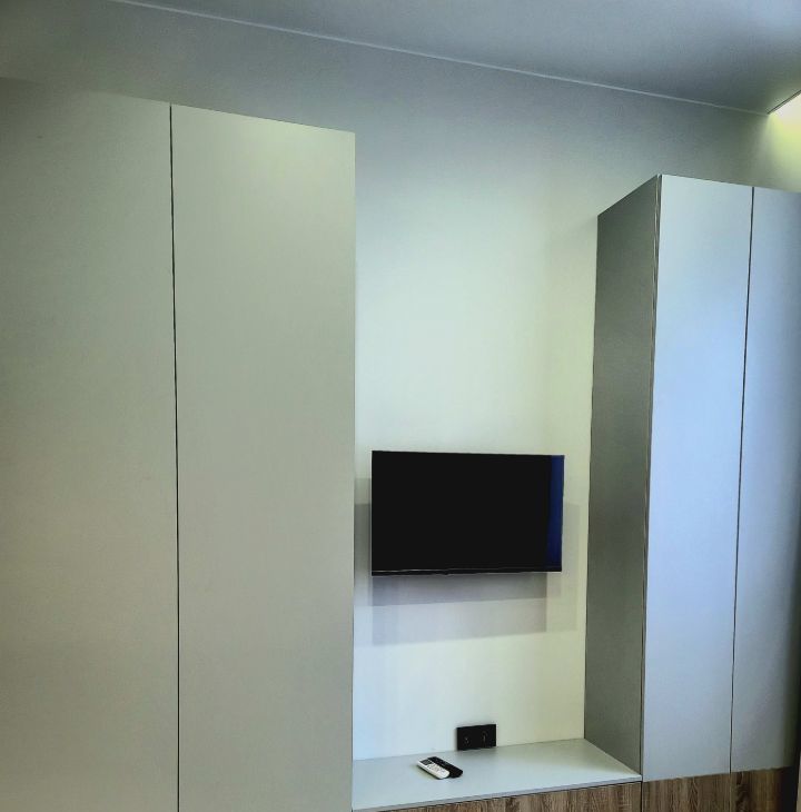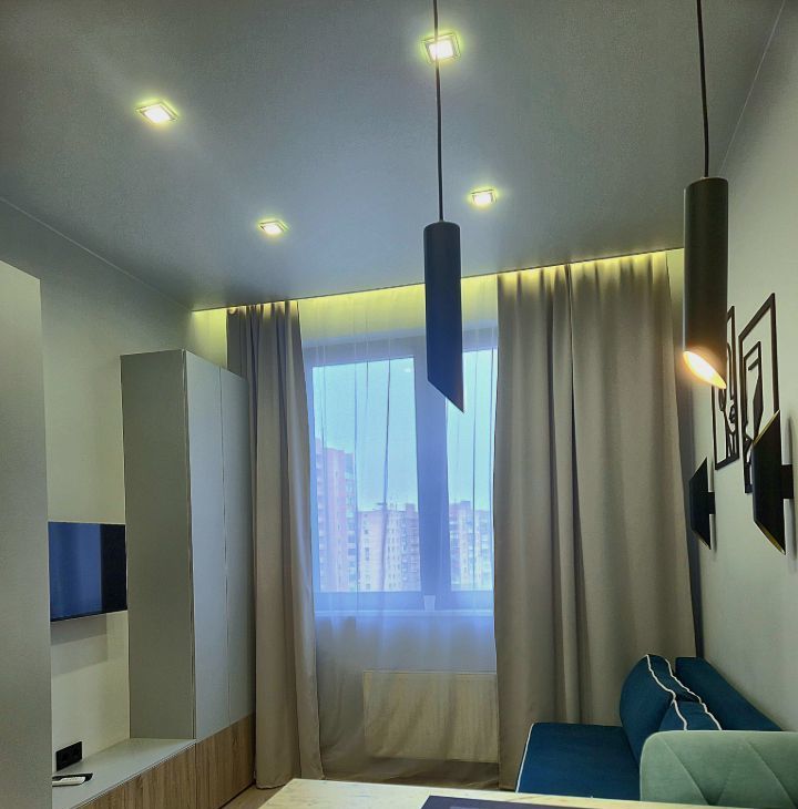 Студия оформлена в современном дизайнерском стиле. Полностью меблирована: удобная мебель в комнате и на кухне. На кухне оборудованы все необходимые зоны, включая место для приёма пищи. В квартире есть кондиционер, телевизор, холодильник и стиральная машина. Санузел совмещённый, оснащён современной душевой кабиной.