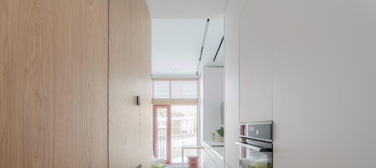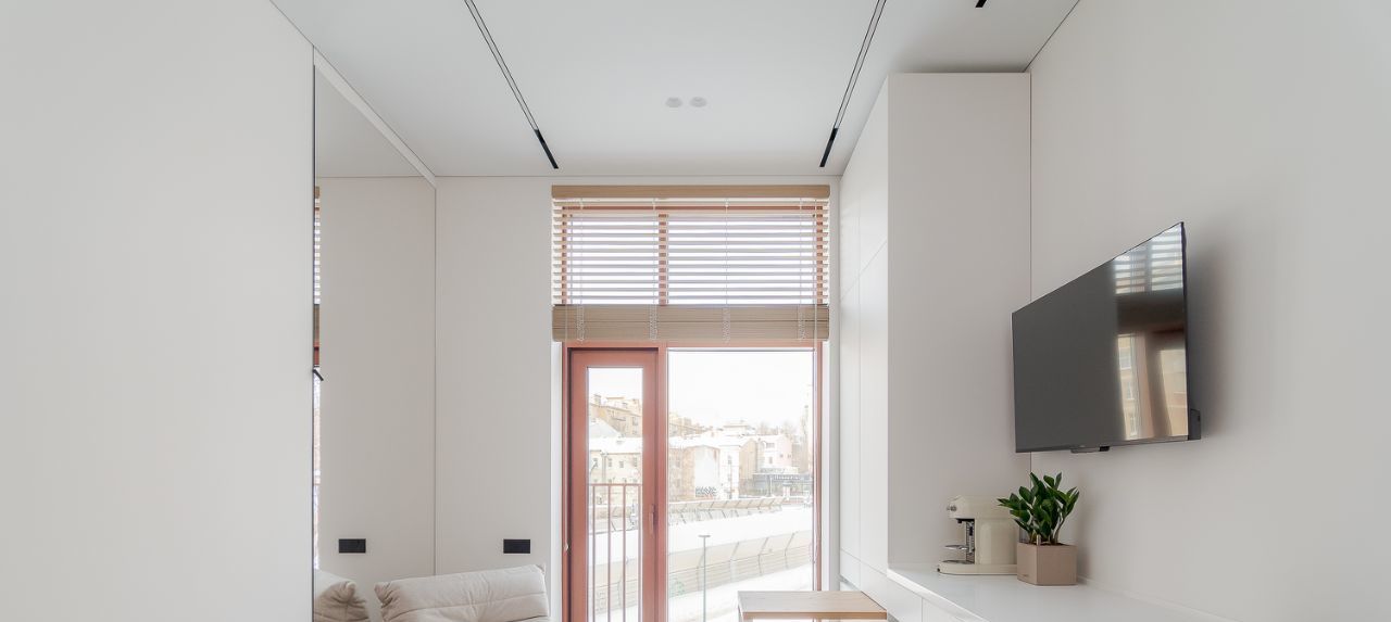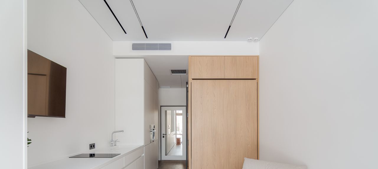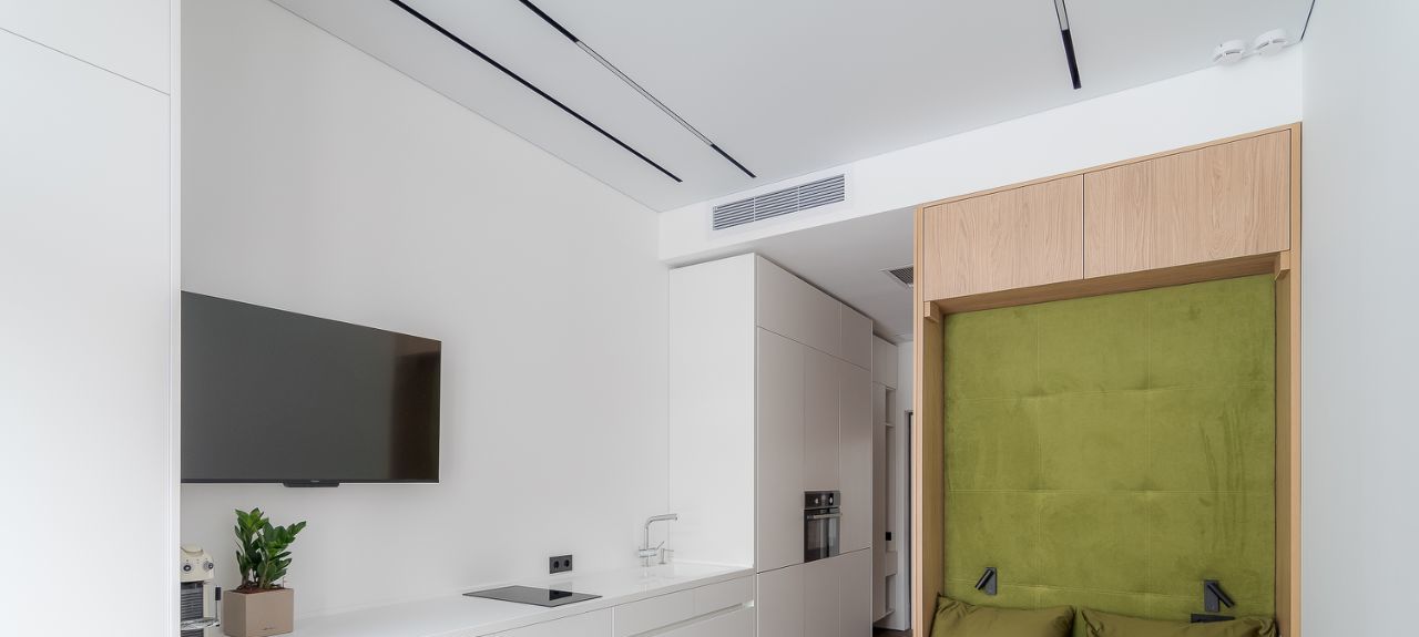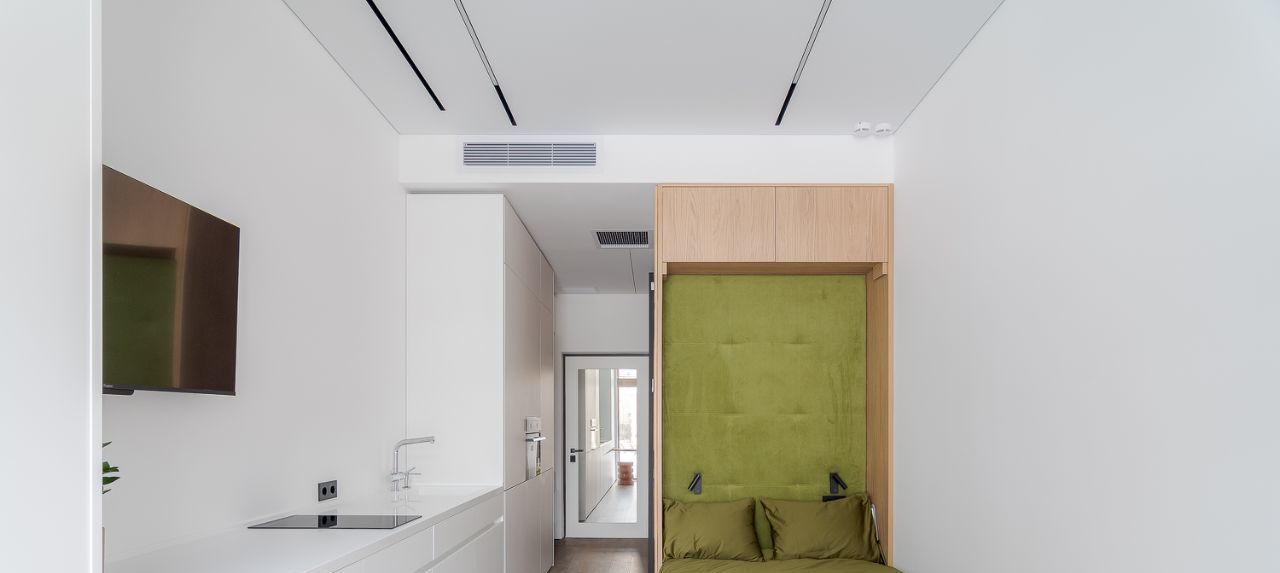 Откидная кровать с ортопедическим матрасом. Эргономичные кресла. Выдвижной стол для работы и еды. Яндекс телевизор со встроенной Алисой. Духовка со встроенной микроволновкой. Стиральная машина. Кондиционер.
