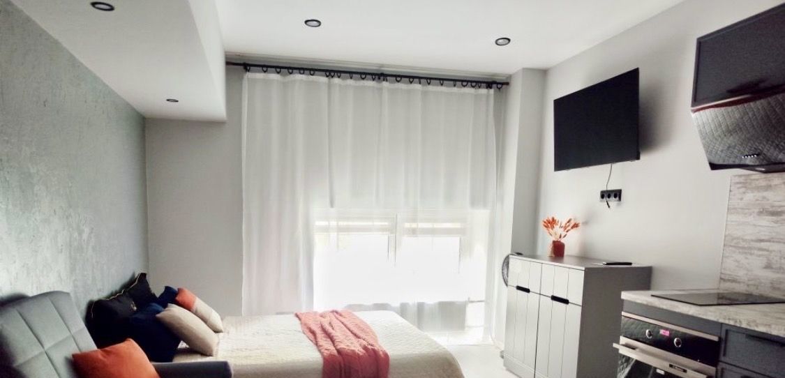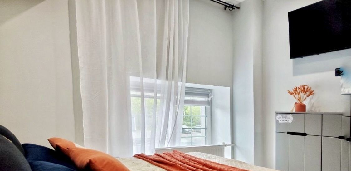 В апартаментах есть вся необходимая мебель как в комнате, так и на кухне. Из техники — холодильник, телевизор и стиральная машина. Санузел совмещённый, оборудован душевой кабиной. Окна выходят на улицу.