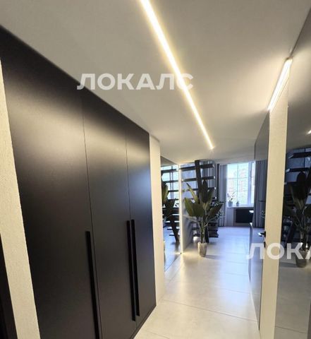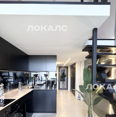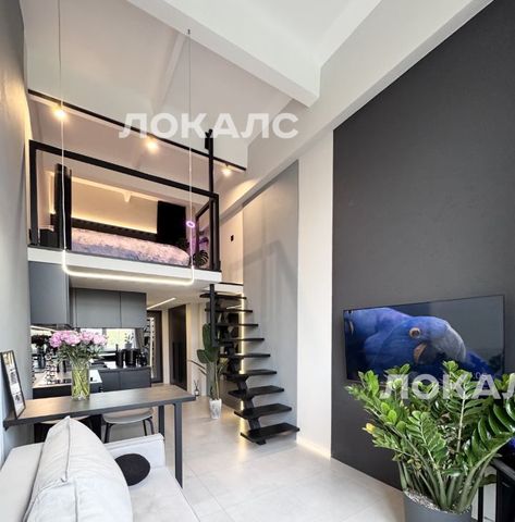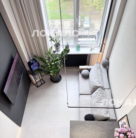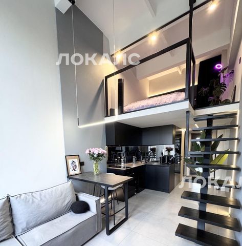 Двухуровневая стильная студия с потолками 4,5 метра, интерьерной подсветкой, большим окном и огромными зеркалами во всю стену, которые умножают ощущение простора и света.