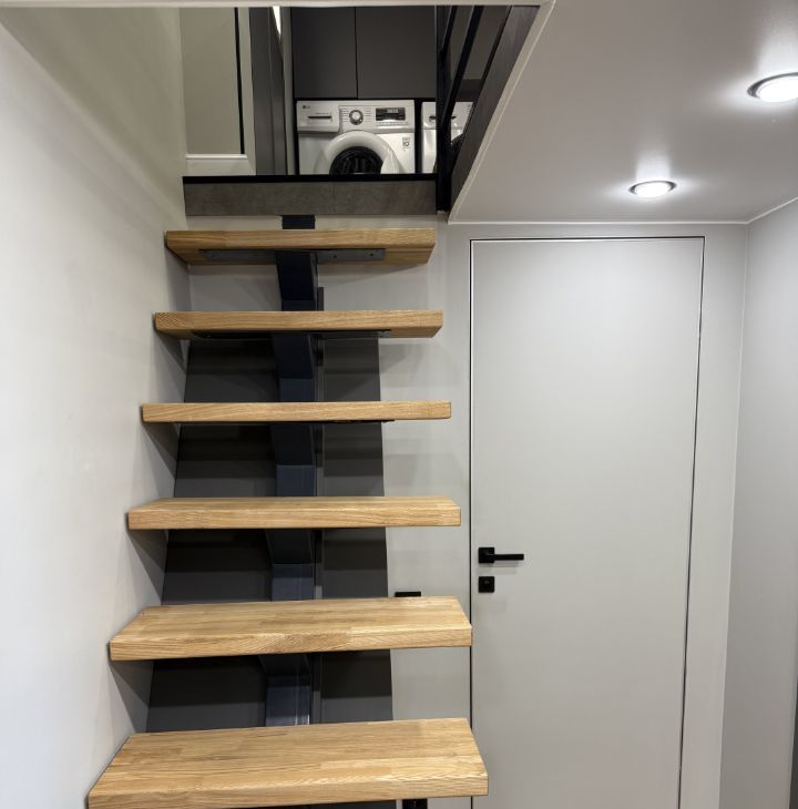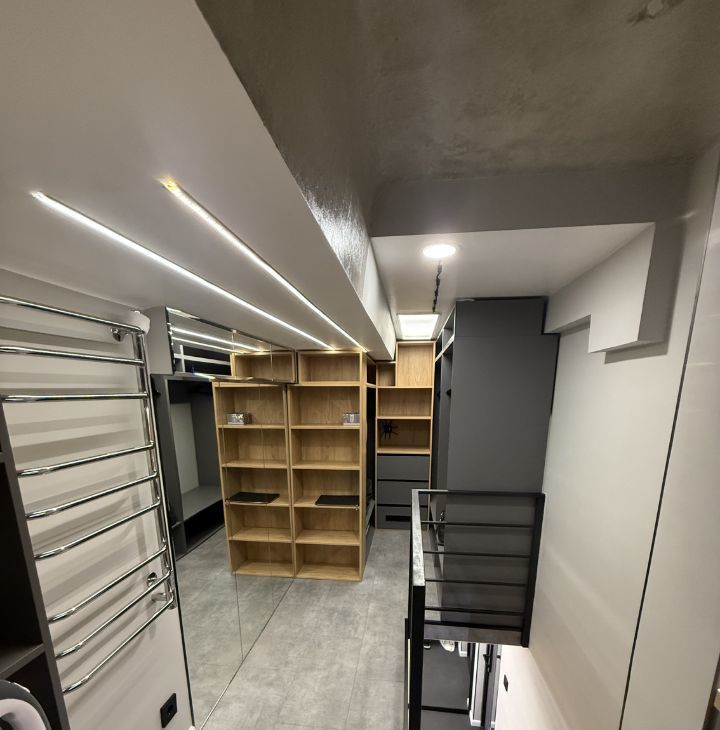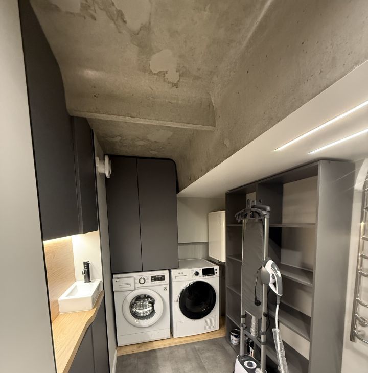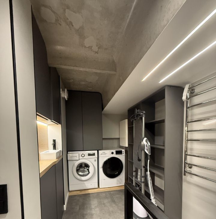 вторая антресоль — практичная постирочная зона со стиральной и сушильной машинами, дополненная гардеробной.