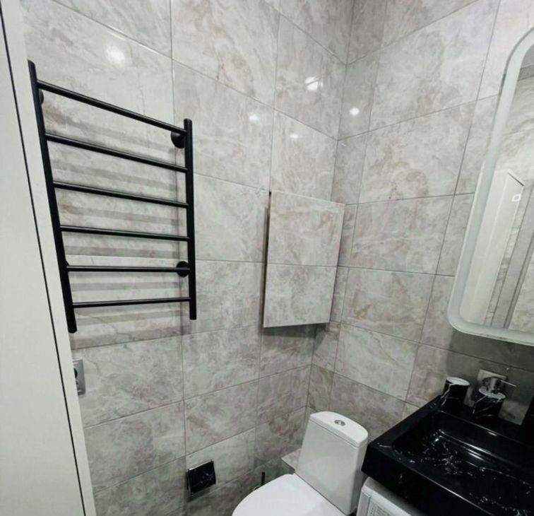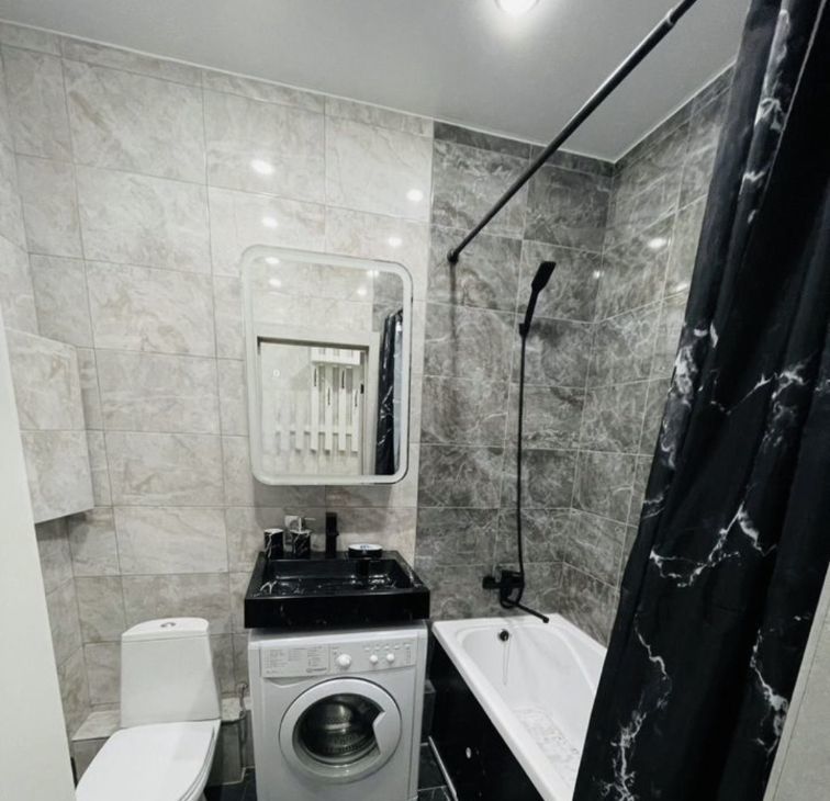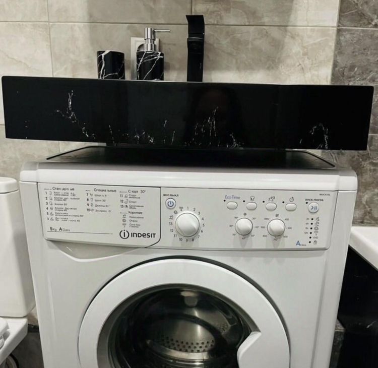 Ванная: Современный ремонт в черно-белой гамме, стиральная машина Indesit.