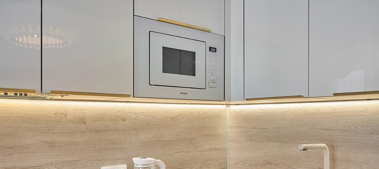 Техническое оснащение - в кухонном гарнитуре установлена стиральная машина, фильтр для воды с накопителем, варочная панель с вытяжкой, СВЧ печь.