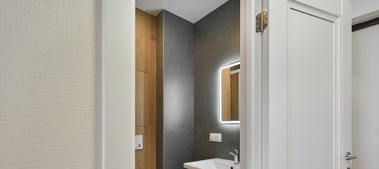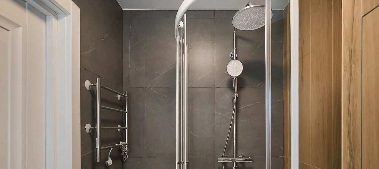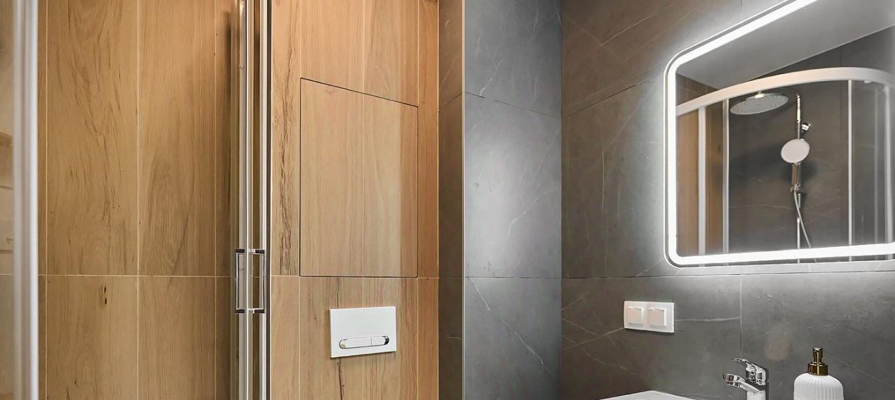 В ванной комнате просторная душевая кабина, зеркало с подсветкой, широкая раковина умывальника.