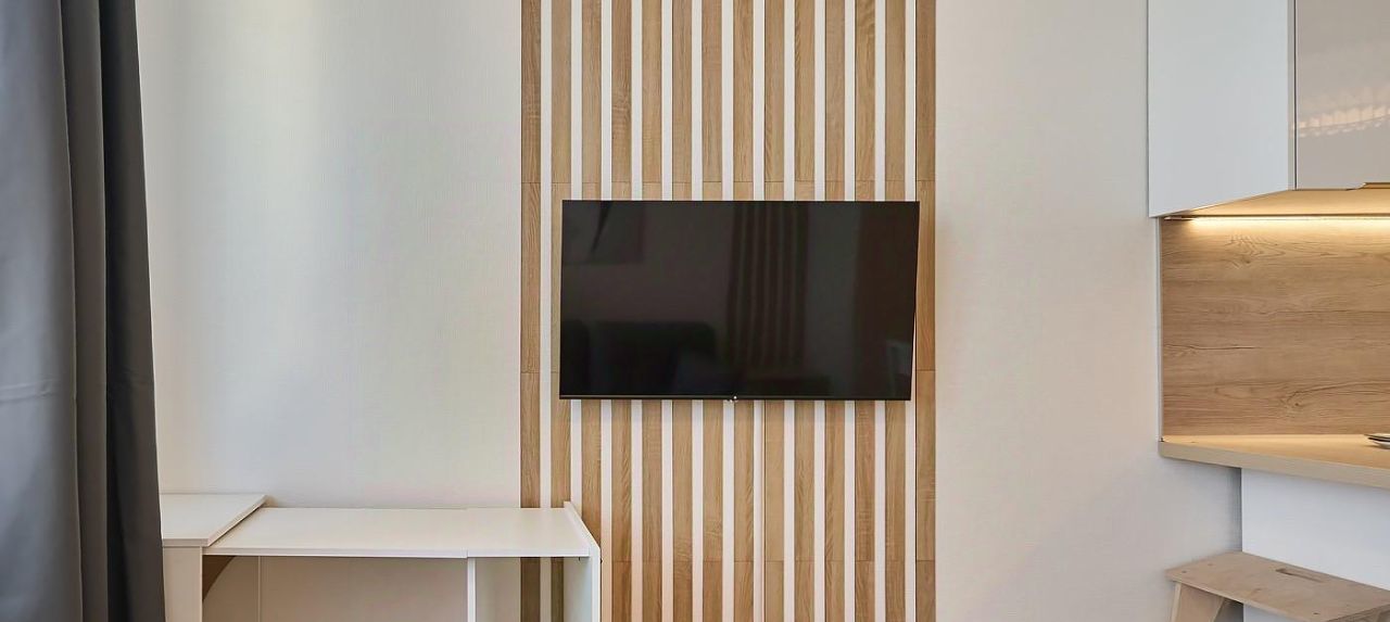 в жилой зоне стоит офисный стол рядом с розеткой и возможностью работать наблюдая панорамные виды, также уютный диван, образующий спальное место с видом на смарт TV от Яндекс.