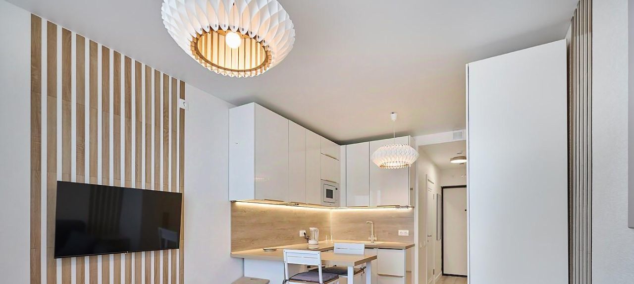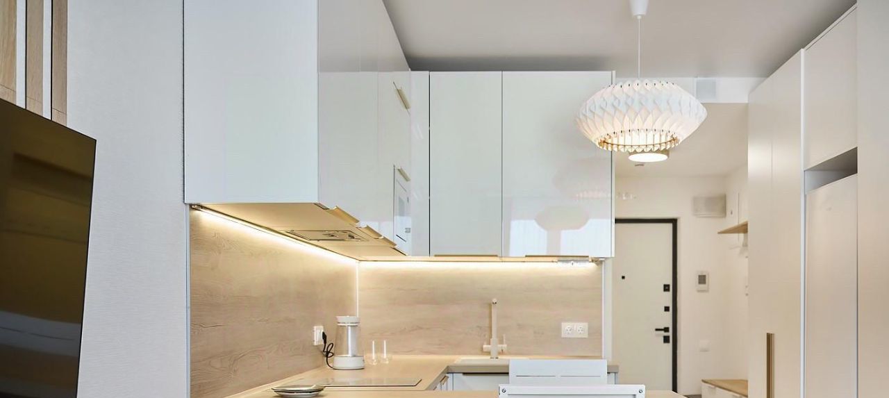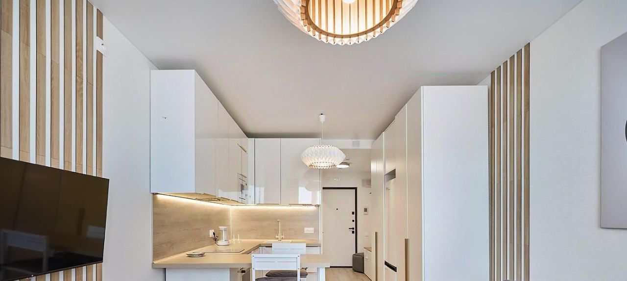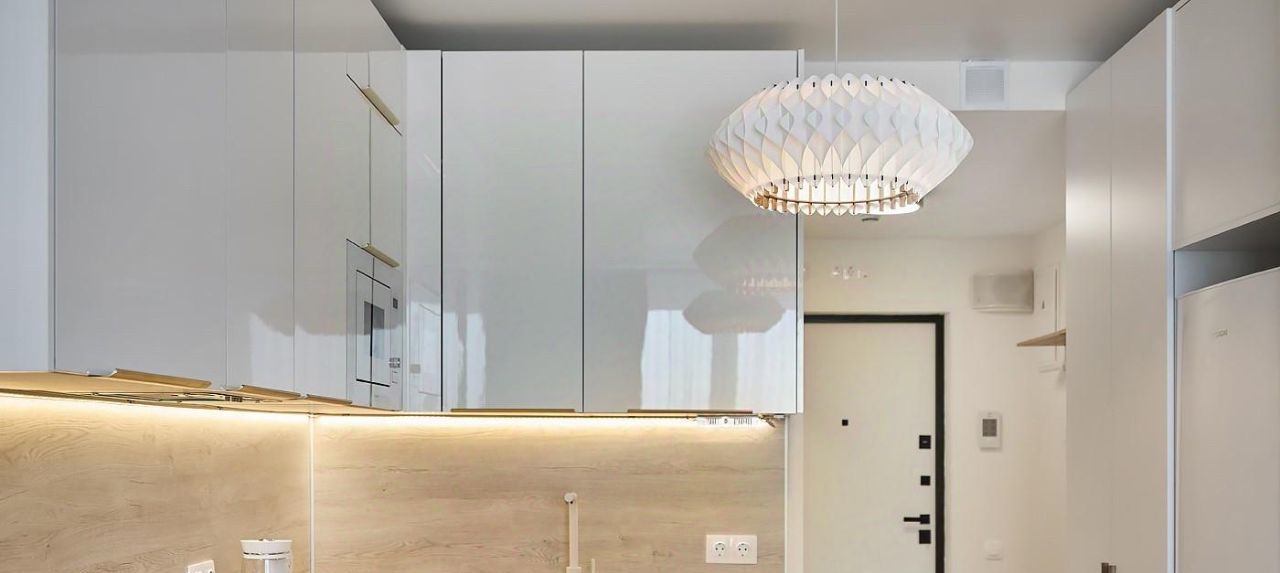 Квартира выполнена в современном стиле, в светлых и серых тонах с элементами дерева. несколько источников света, роскошные люстры, LED подсветка от кухни и естественное освещение из окон с восточной стороны. В студии множество мест хранения.