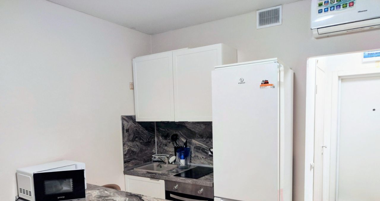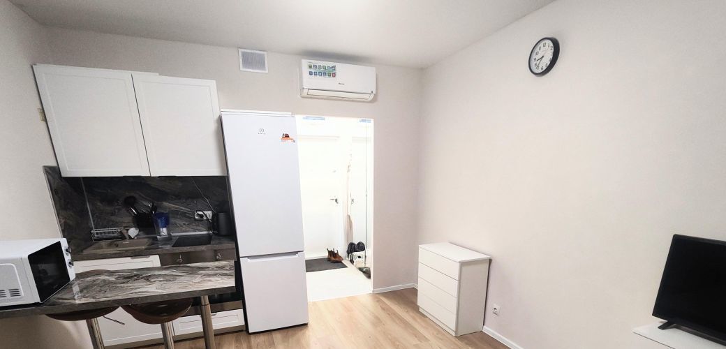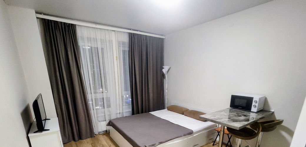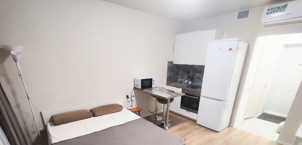 Отличная видовая студия. Прекрасный вариант для тихих вечеров или удаленной работы. Есть все необходимое для жизни, кухня, душевая, стиральная машина, кондиционер, интернет, ТВ, рабочее место, спальное место. В коридоре большой шкаф с зеркалом в полный рост. Метро в шаговой доступности, развитая инфраструктура района.
