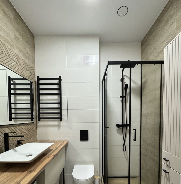 В САНУЗЛЕ душевой уголок, стирально-сушильная машина, умный теплый пол, электрический полотенцесушитель, шкаф и тумба, гидролок на случай протечки, проточный водонагреватель на период отключения горячей воды.
