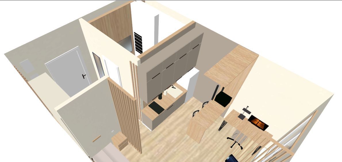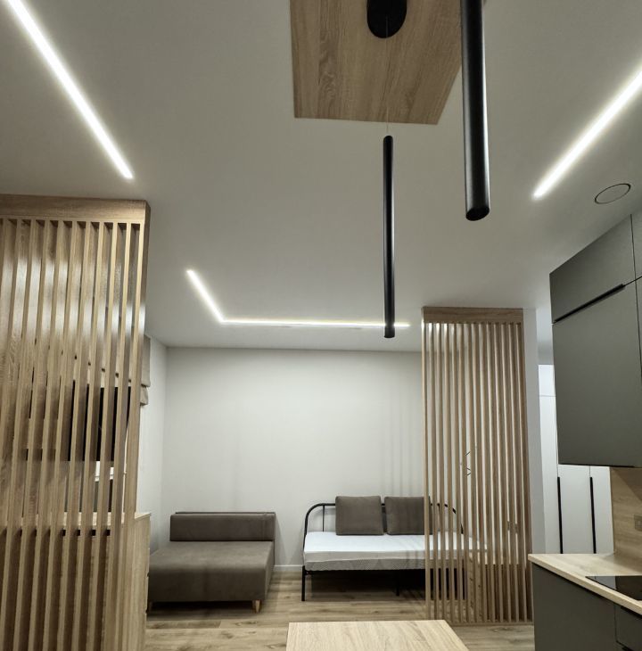 КОМНАТА разделена на 4 зоны: кухня с большим гарнитуром и барной стойкой; просторное рабочее место; зона отдыха (двуспальный диван с блоком независимых пружин, телевизором и комодом); спальное место (односпальная кровать с ортопедическим матрасом и тумбой). Места разделены перегородками, чтобы не мешать друг другу.