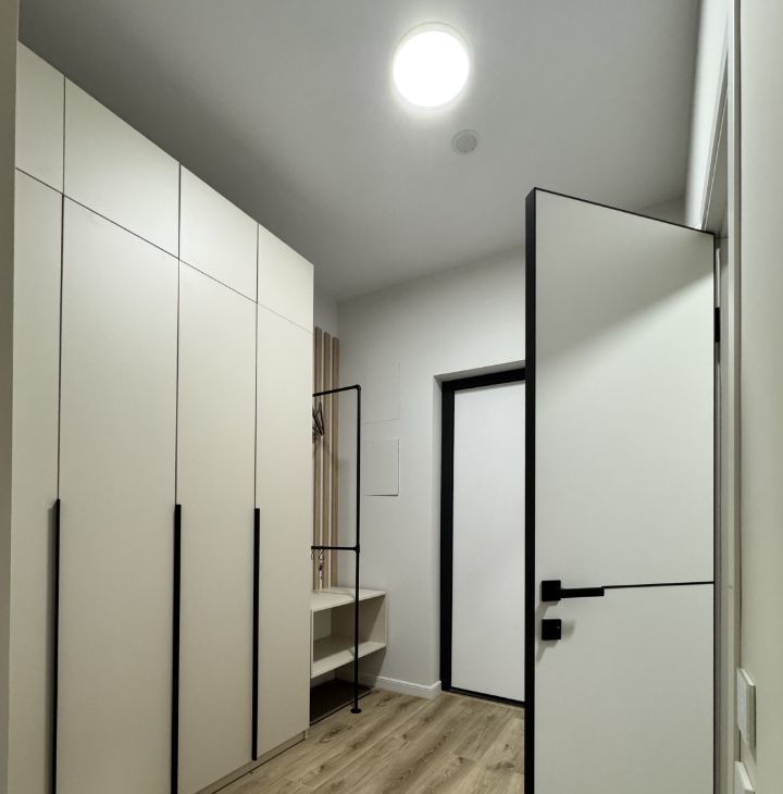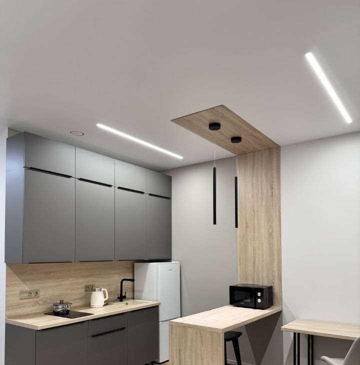 ТЕХНИКА: индукционная плита на 2 конфорки, холодильник с морозильной камерой, микроволновка, эл.чайник, эл.кофеварка, фильтр для питьевой воды, телевизор с Android TV, стирально-сушильная машина, водонагреватель, пылесос, утюг, умные выключатели (можно подключить к телефону или колонке).