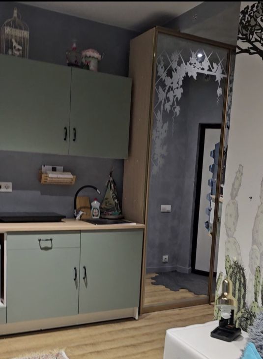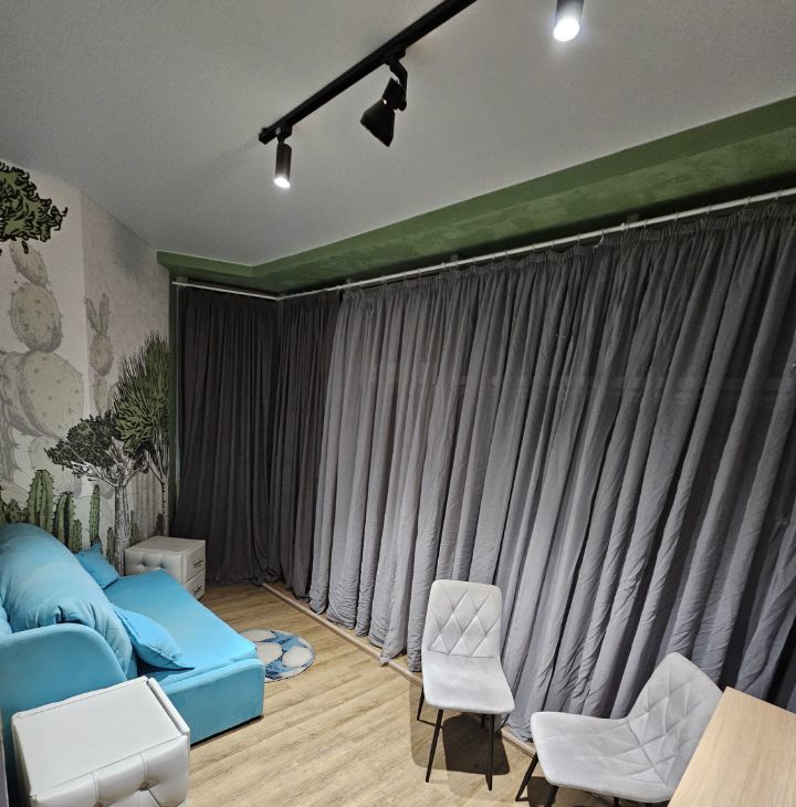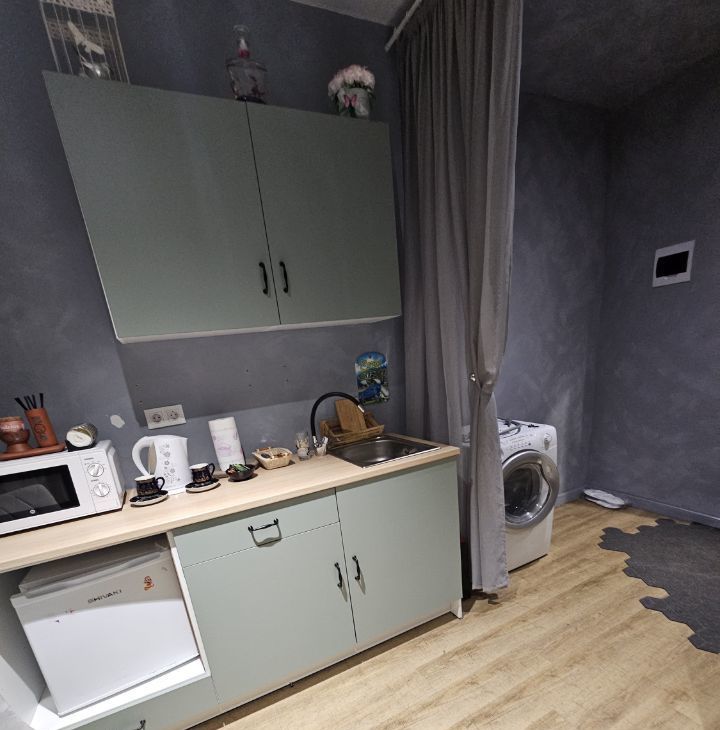 В студии сделан дизайнерский ремонт, поэтому обстановка стильная и современная. В квартире есть всё необходимое для комфортного проживания: на кухне и в комнате установлена мебель, а также имеется холодильник и стиральная машина. Санузел совмещённый, с душевой кабиной.