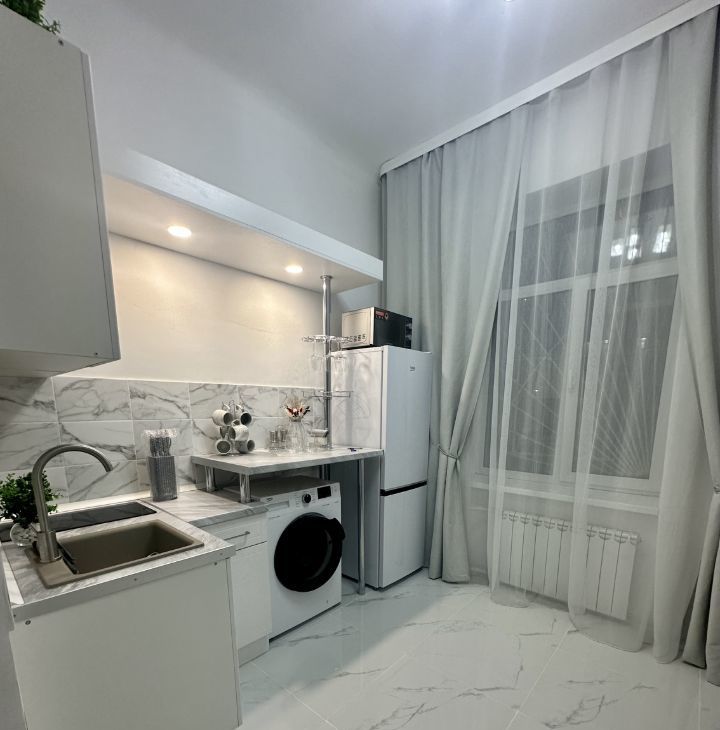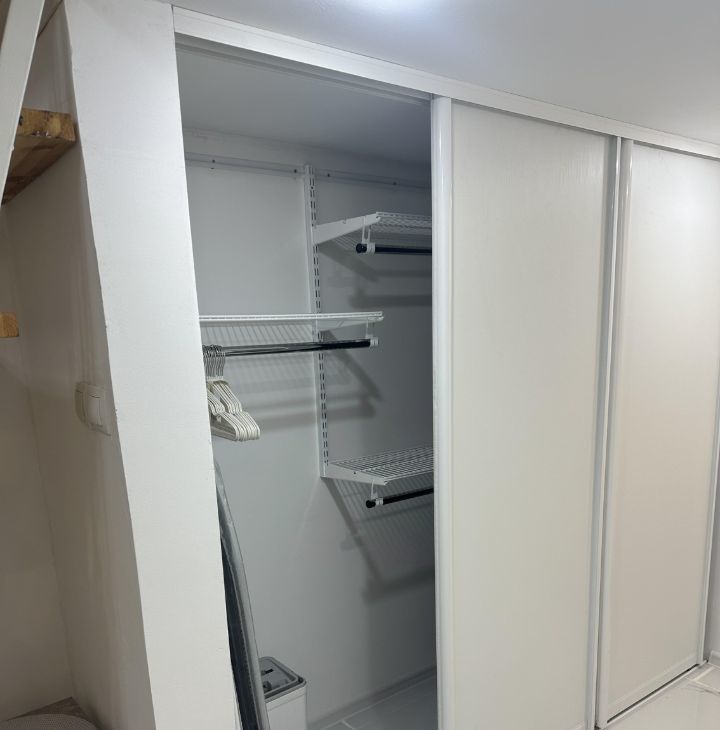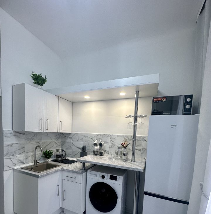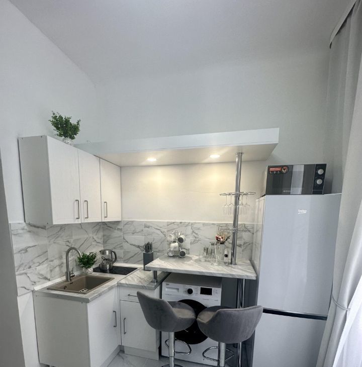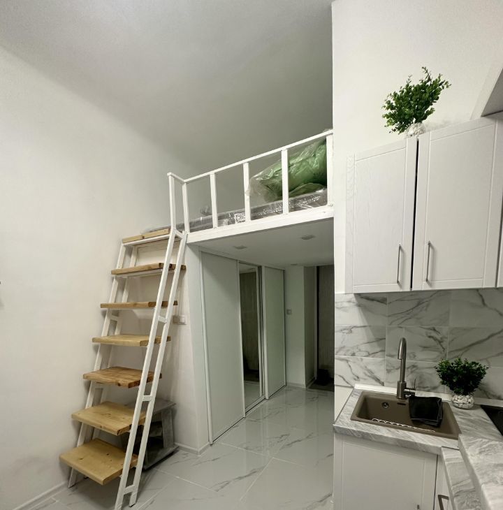 Студия оборудована бытовой техникой и мебелью. Имеется антресоль с двухспальным матрасом. В студии есть кондиционер для комфортного проживания в любое время года. Окна выходят на тихий двор, что обеспечивает спокойствие и уют. Парковка открытая во дворе, доступна для всех жильцов.