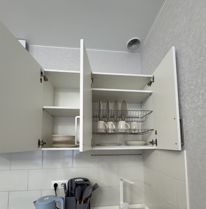 Отдельное спальное место, гостевой диван раскладной, стол, стулья, телевизор, шкаф для хранения вещей, комод, место для хранения обуви, кухонный гарнитур, холодильник, варочная панель, чайник, и вся необходимая посуда.