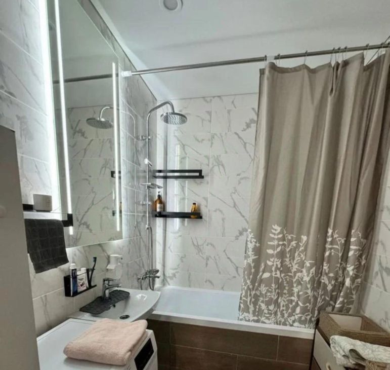 В ванной комнате расположена стиральная машина с сушкой, которая за 3ч делает вещи чистыми, сухими и тёплыми :)