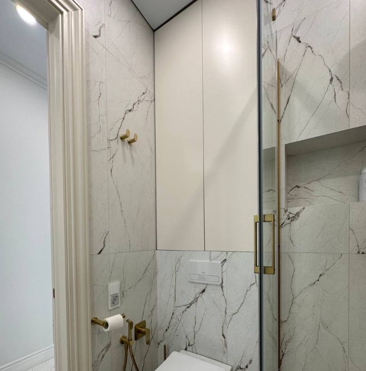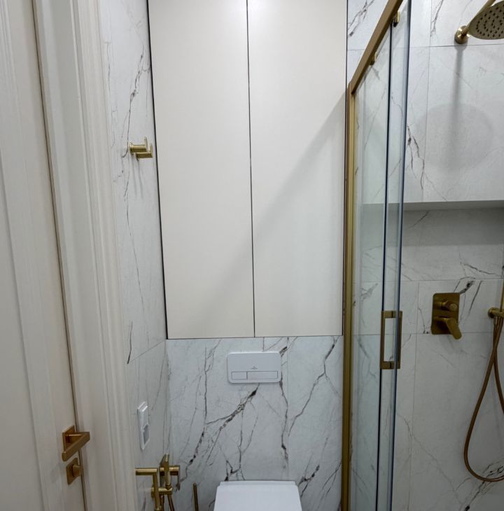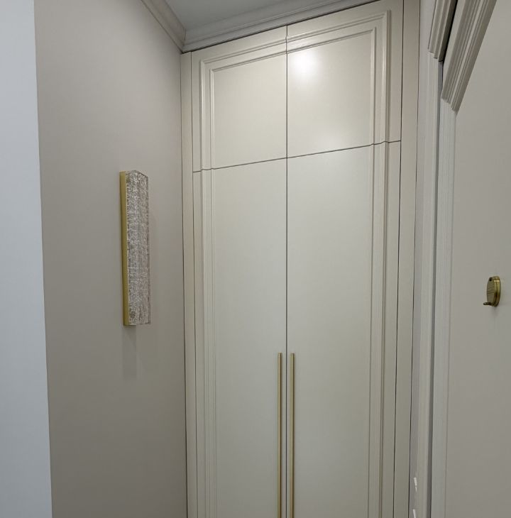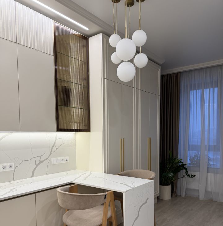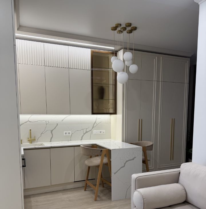 - Формат студии с продуманной планировкой и выделенной гардеробной, много шкафов и мест для хранения.