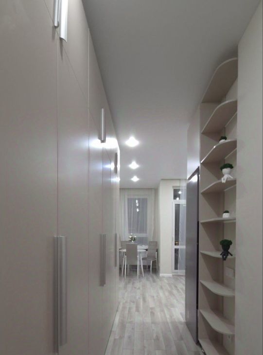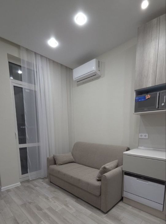 Студия выполнена в дизайнерском стиле, что придаёт ей индивидуальность и комфорт. В квартире есть всё необходимое для комфортного проживания: на кухне и в комнате установлена мебель, а также имеется холодильник и стиральная машина.