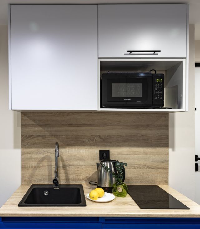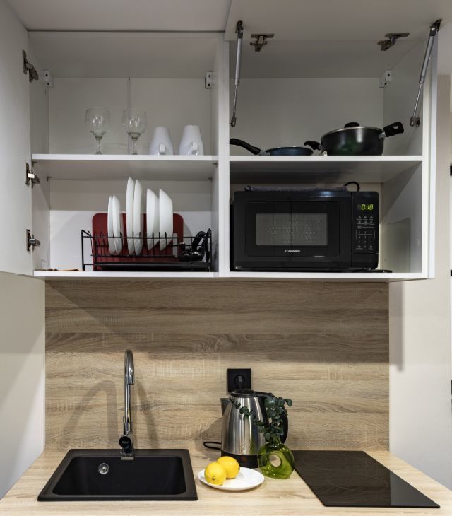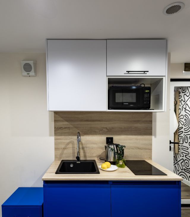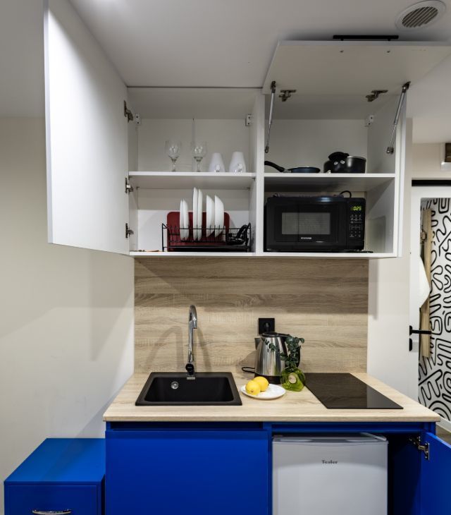 • Кухня: полностью оборудованная мини-кухня с холодильником, электрочайником и всей необходимой посудой