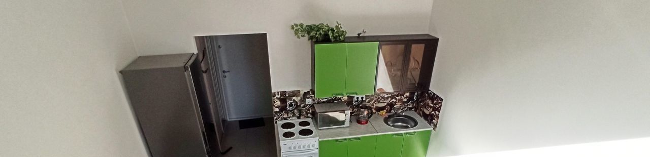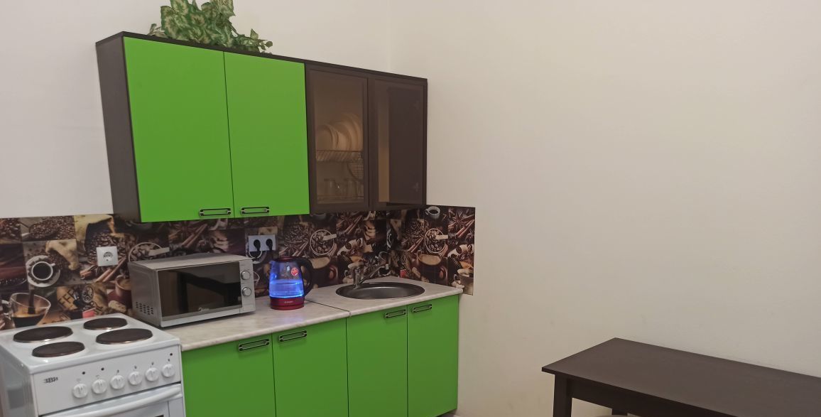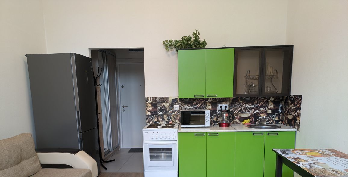 Оснащена необходимой мебелью и современной качественной техникой, всё в отличном состоянии: встроенный кухонный гарнитур, большой раскладной диван, БЕСШУМНЫЙ двухкамерный холодильник, электрическая плита, свч-печь, вешалка металлическая для одежды, вместительный шкаф купе,стеллаж, компьютерный стол. Санузел совмещённый, душевая. Панорамные окна во двор, ландшафтный дизайн. За счёт высоких потолков квартира очень светлая,уютная,просторная.