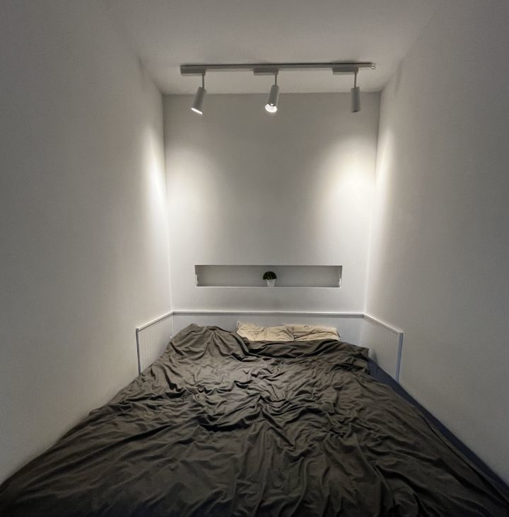 • Уютная спальня с большой кроватью и подсветкой, кровать с выкатными ящиками.