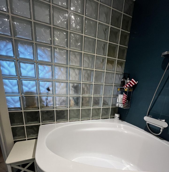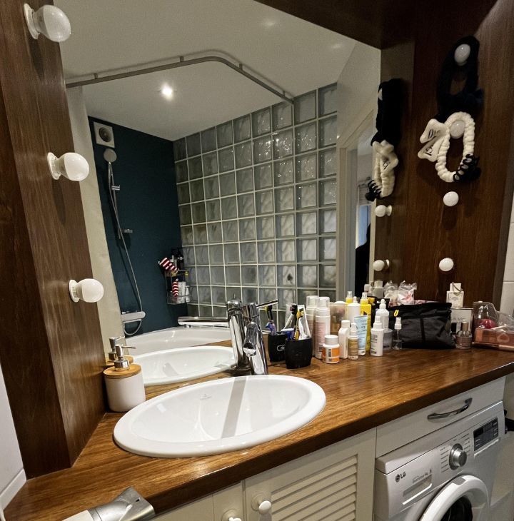 • Просторная ванна, раковина с большой столешницей и зеркалом с подсветкой.