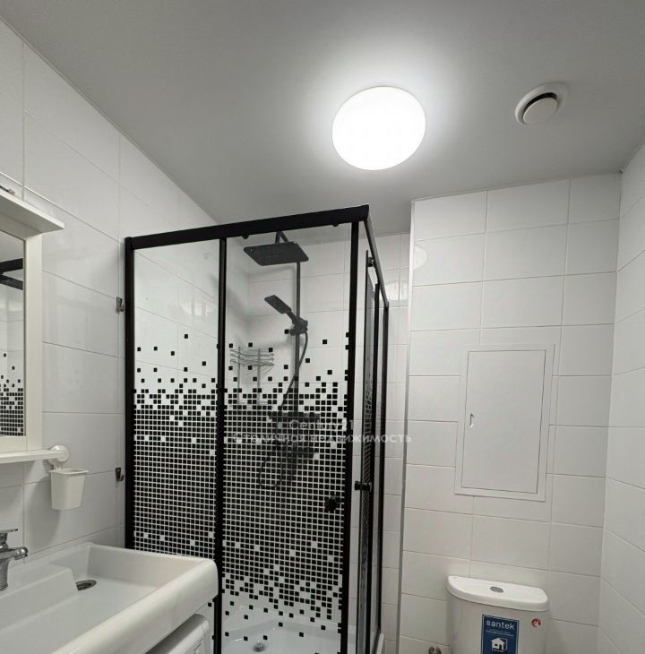 Совмещенный санузел с душевой зоной делает пространство современным и практичным.