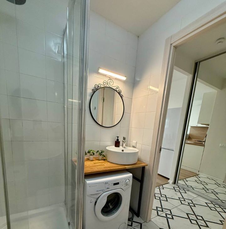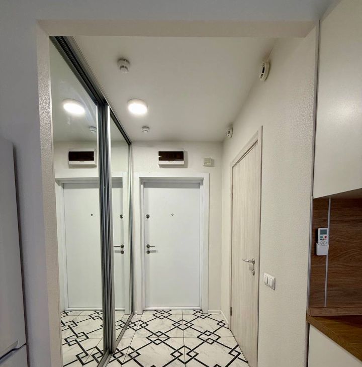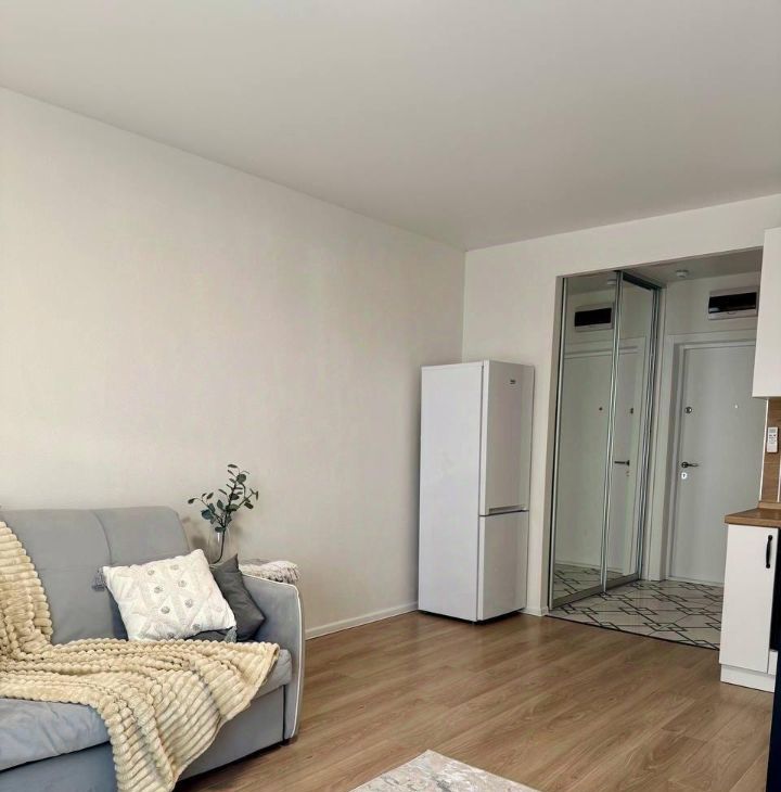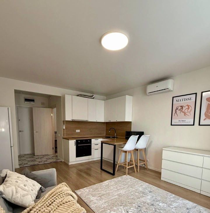 СТУДИЯ укомплектована всей необходимой современной мебелью: комфортный для отдыха диван-аккордеон, 2 комода для хранения, встроенный вместительный зеркальный шкаф-купе, кухонный гарнитур.