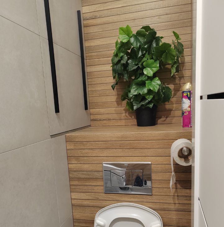 Совмещенный санузел выполнен в светлых тонах с современной сантехникой.