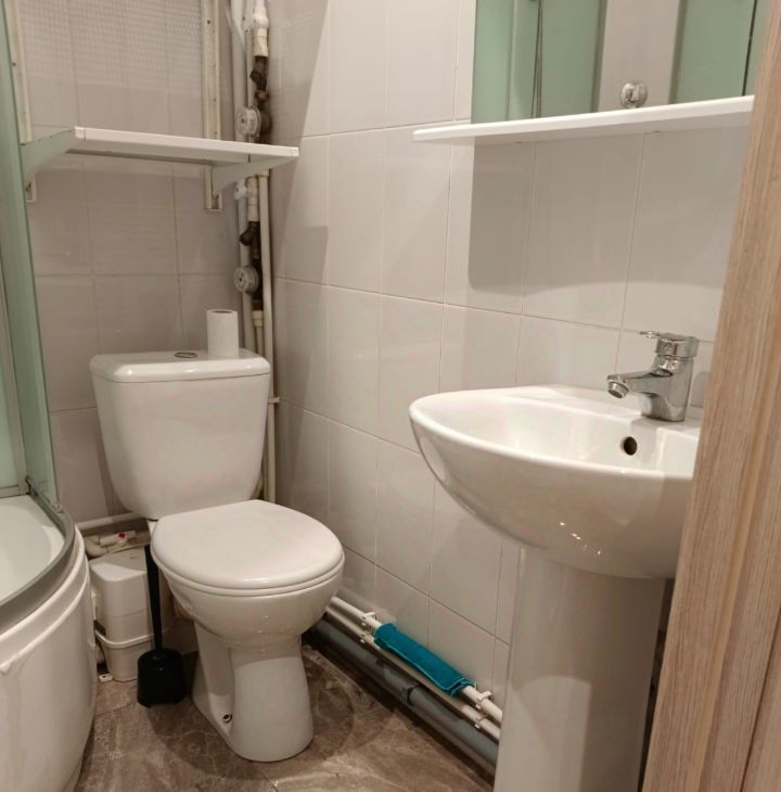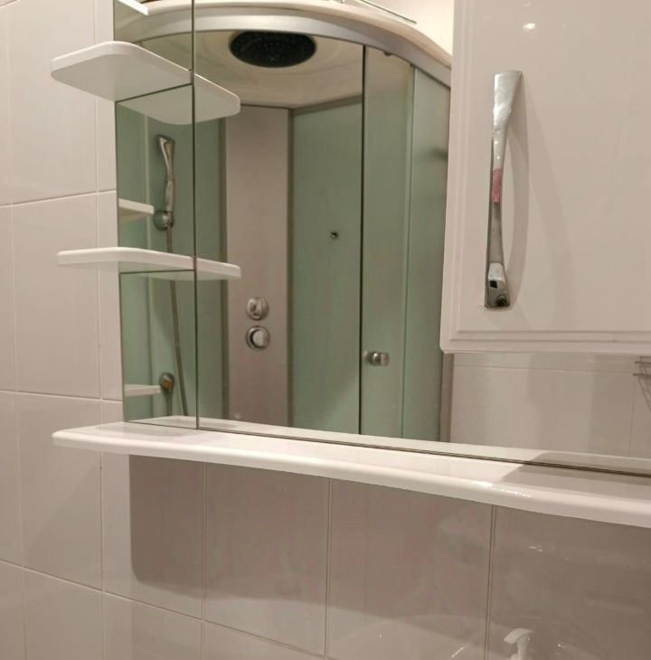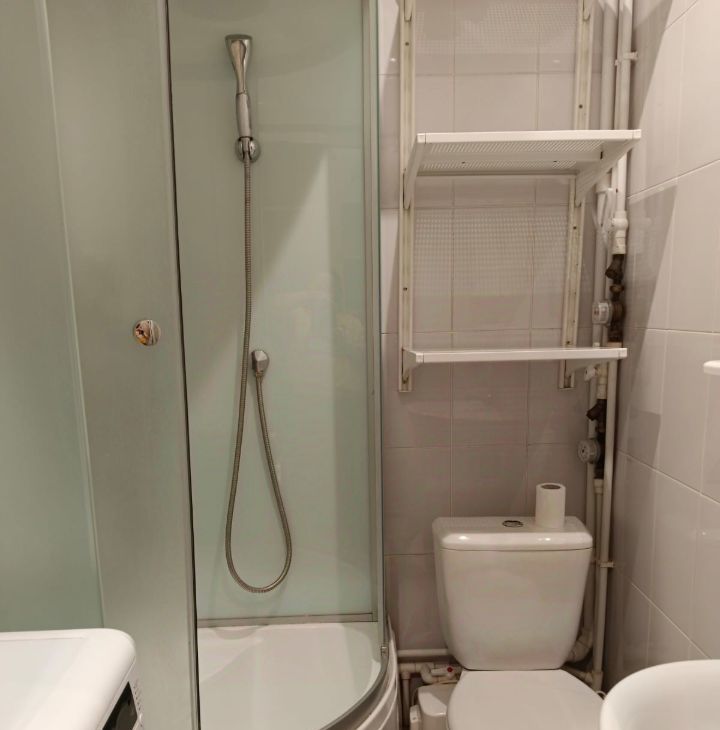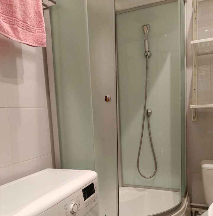 В комнате установлена мебель, а также вся необходимая техника: холодильник, телевизор и стиральная машина. Санузел совмещённый, оборудован душевой кабиной.