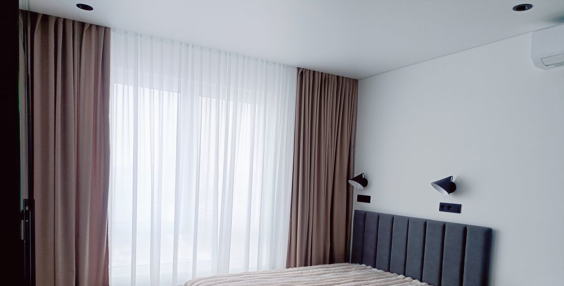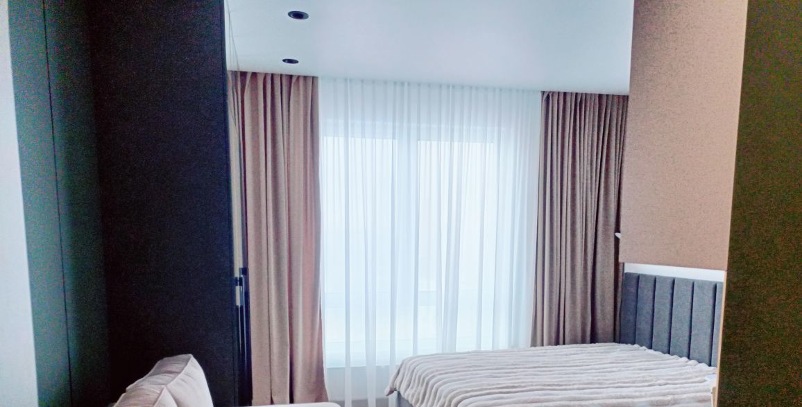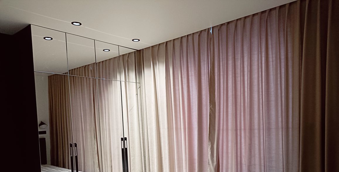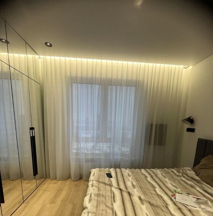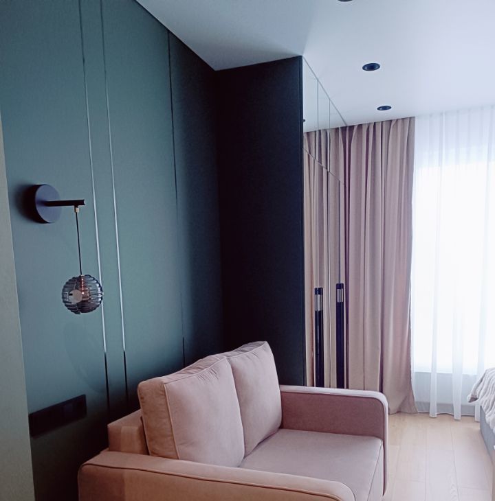 Интерьер выполнен по авторскому проекту: мебель на заказ, включая большой зеркальный шкаф в потолок в комнате и второй в коридоре, раскладной диван и полноценную кровать. Плотные шторы и тюль создают приватность и уют, а естественный свет наполняет пространство.