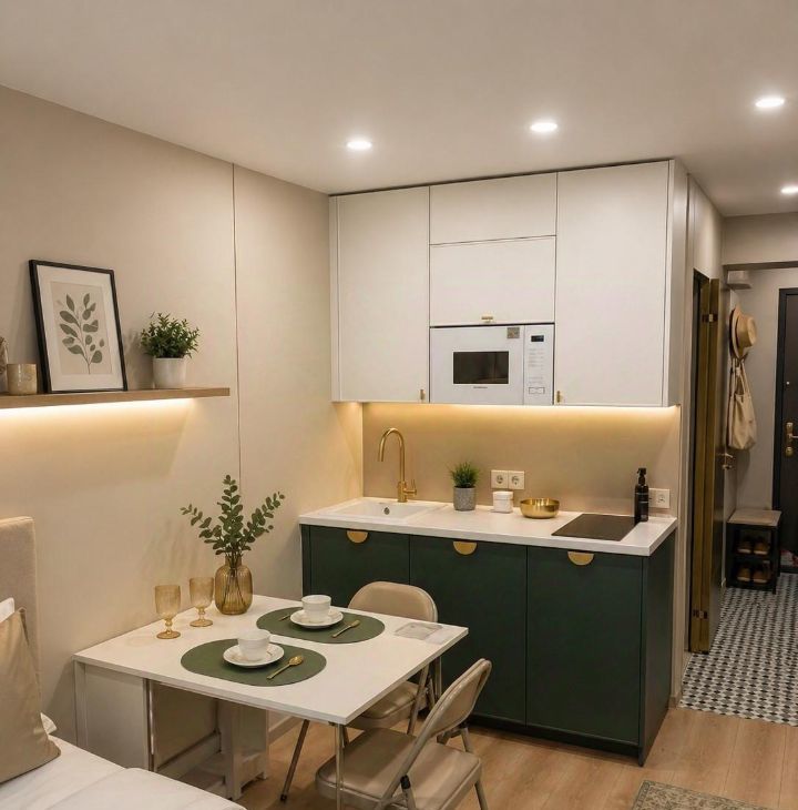 Кухня: плита, холодильник, микроволновка.