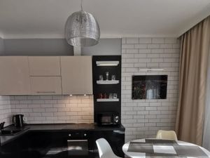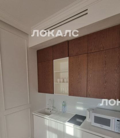 Белоснежный кухонный гарнитур оснащен современной техникой, включая варочную панель. В ванной комнате - душевая кабина. В прихожей - вместительный шкаф. Установлена система кондиционирования, стиральная машина с функцией сушки.