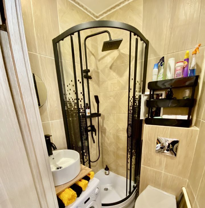 В комнате -телевизор с 260 каналами Кион, высокоскоростной интернет 500мг/б. Спальное место- 180/240 оборудованная ниша с новым ортопедическим матрасом. Под нишей расположен удобный диванчик, с пледом, журнальным столиком, и турецким ковром. Шкаф для одежды и лестница сделаны из экологически чистого материала- сосна. В квартире расположена очень эргономичная душевая кабина с гигиеническим и тропическим душем, есть стиральная машина, унитаз, керамическая раковина и полотенцесушитель. Все гигиенические и бытовые средства в наличии.