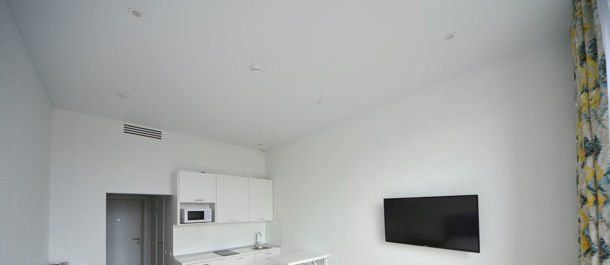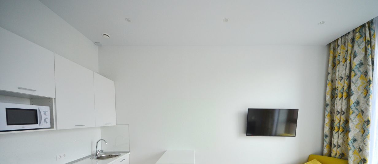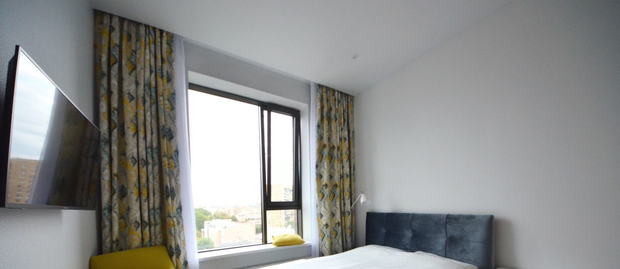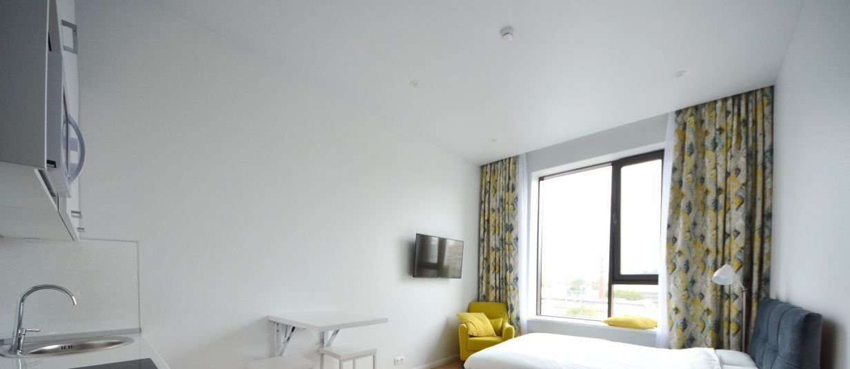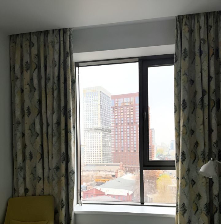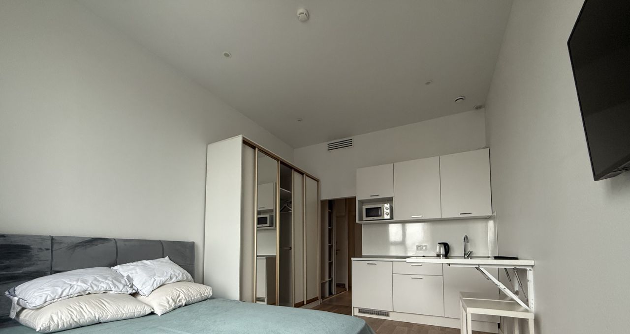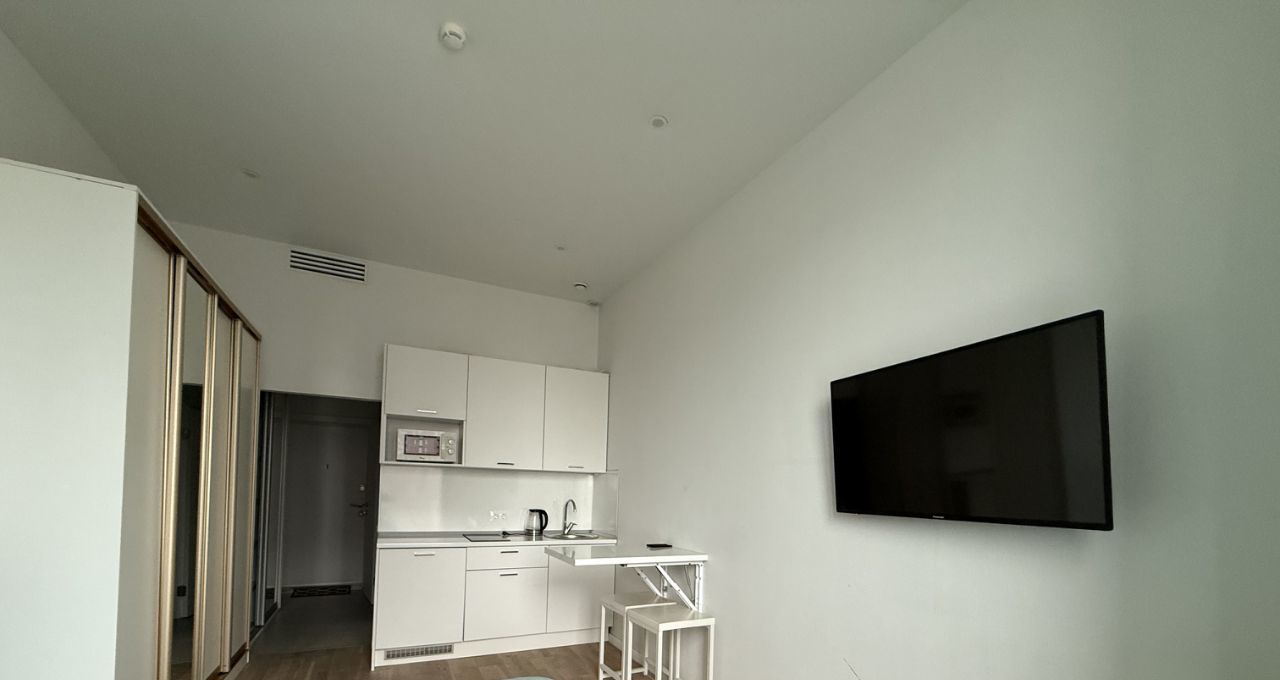 Отдельные плюсы - приятный вид в сторону новой современной элитной застройки, большое окно практически во всю стену и высокие потолки 3,3 метра! Благодаря этому в студии приятно находиться, она выигрывает по сравнению с предложениями в других домах при сдаче в аренду.