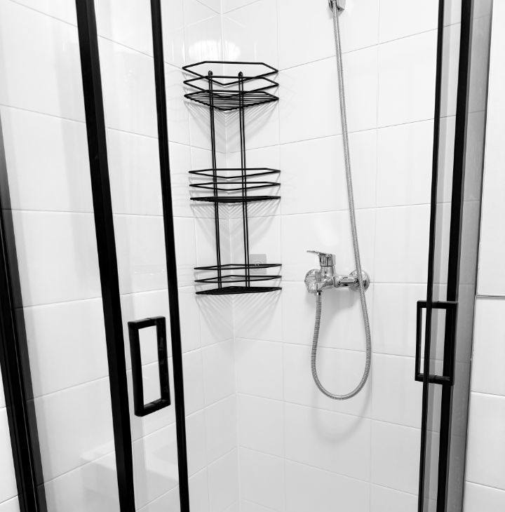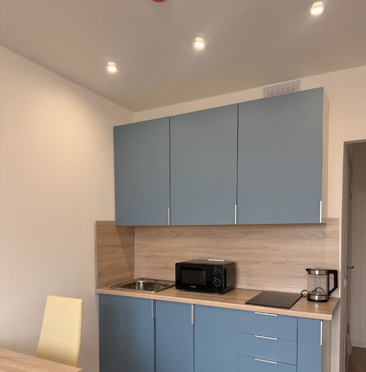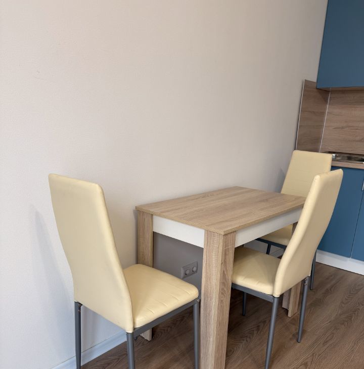 В квартире есть все необходимое для комфортного проживания: на кухне установлена мебель и техника, включая холодильник, а также обеденная зона. В комнате также предусмотрена мебель для удобства. Ванная комната оборудована душевой кабиной и стиральной машиной.