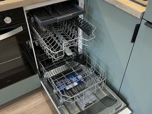 В кухонной зоне установлен двухкамерный холодильник Haier C2F637CWMV, электрическая варочная поверхность Gorenje ECT643WCSC, кухонная вытяжка ZIGMUND & SHTAIN K002.61 (не рециркулятор!), посудомоечная машина Electrolux ESL94200LO, микроволновая печь LG MS2042D и другие необходимые мелочи (фен, утюг, пылесос увлажнитель воздуха, чайник, выделена обеденная зона.