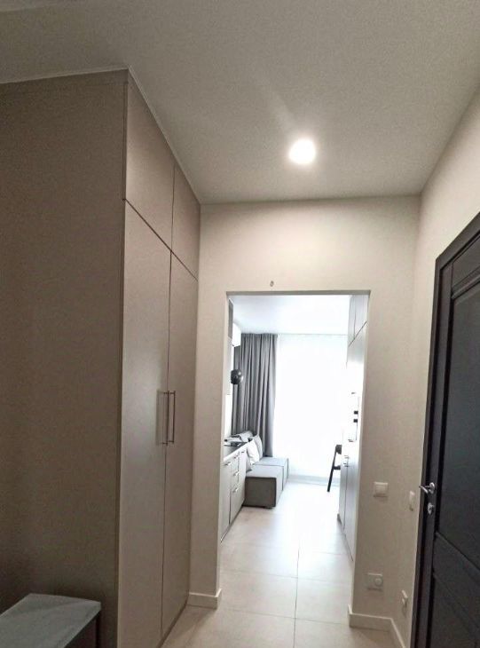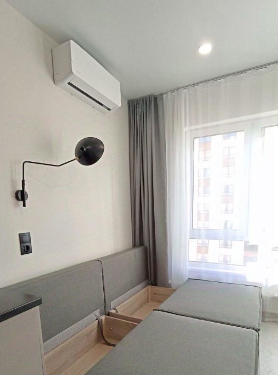 Студия 30 кв.м. с выделенной зоной спальни. В квартире 2 спальных места: двуспальная кровать и раскладной диван.